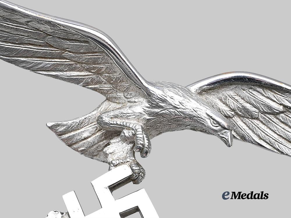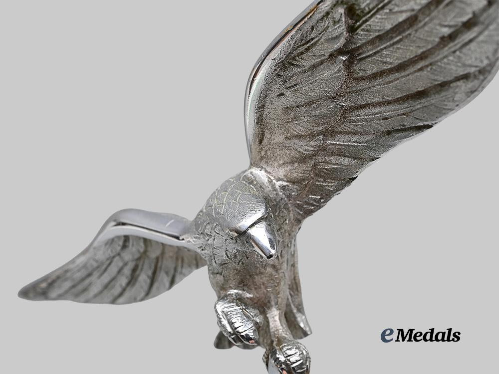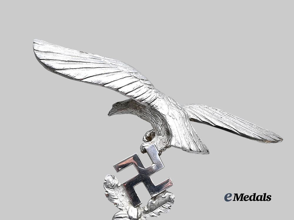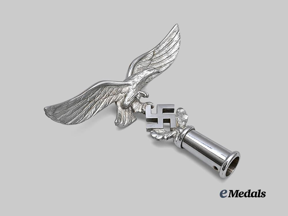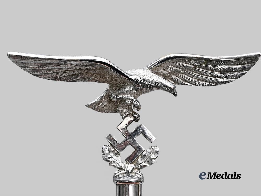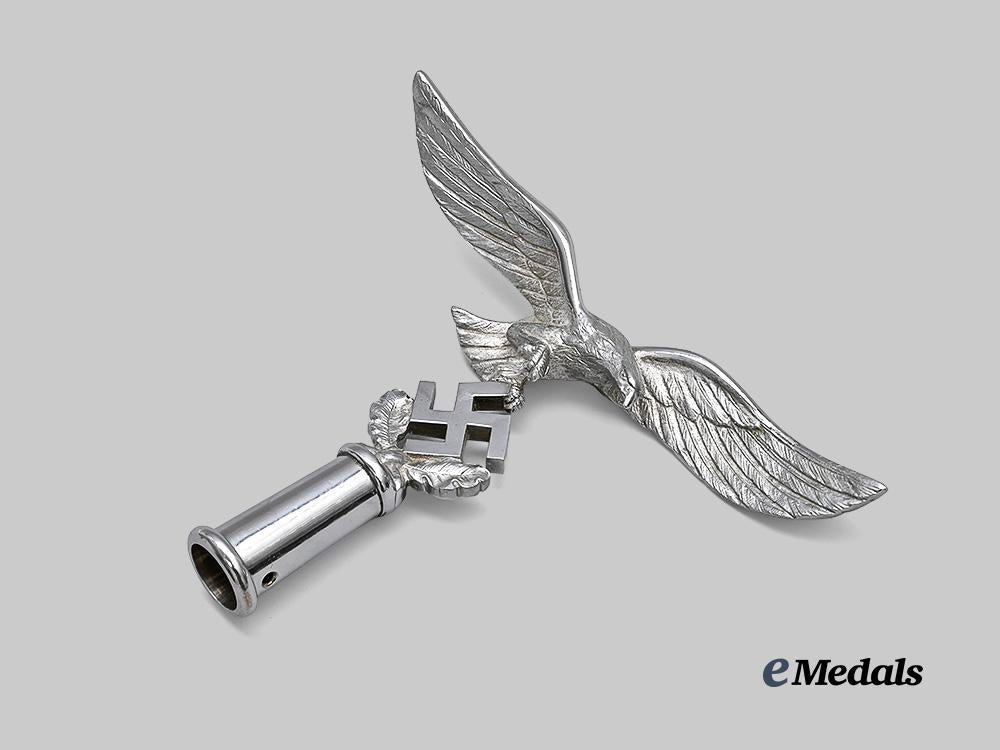 (Fahnenspitze für Truppenstandarten der Luftwaffe - II. Modell). Constructed of nickel-plated brass, consisting of an finely detailed Luftwaffe eagle in the round, with its wings outstretched, and with one set of talons raised while the other grips a mobile swastika, itself situated within a pair of oak leaves, all emanating from an elongated hollow base which is perforated with dual eyelets to accommodate a screw which locks the finial onto an accompanying regimental standard pole, unmarked, measuring 23.5 cm (w) x 19 cm (h), a striking and exceptionally rare example which retains virtually all of its original nickel plating, and among few known examples residing outside of museum collections, in near mint condition.