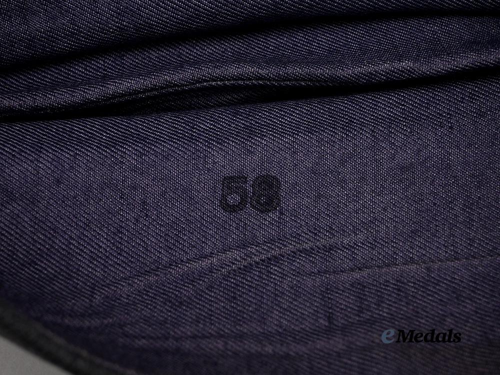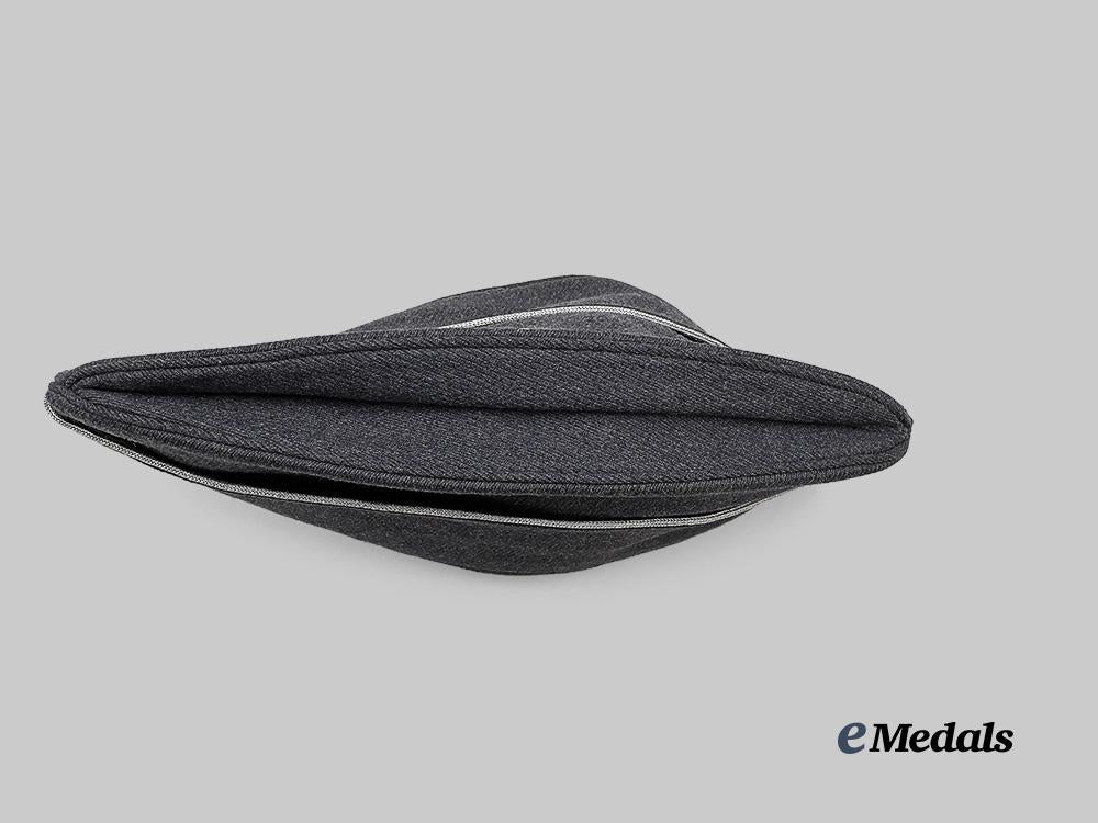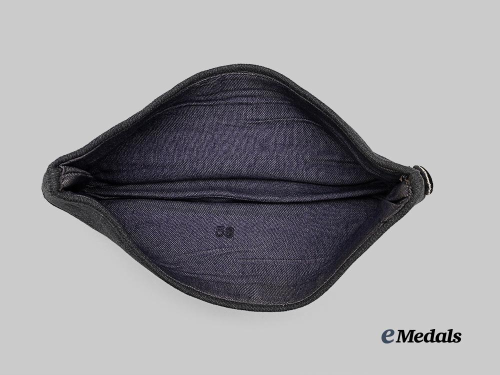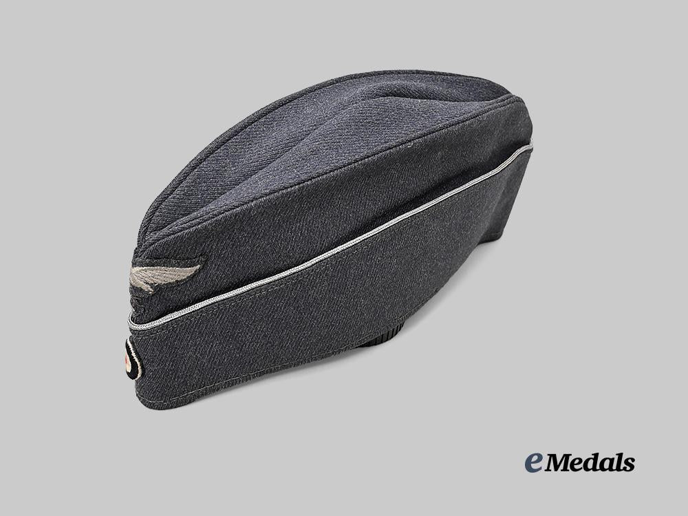 (Luftwaffe Schiffchen für Offiziere). A well-preserved Luftwaffe Officer’s overseas field cap, constructed of dark grey wool with a subtle whipcord weave. It is fully surrounded by fold-down side walls which are trimmed along the edge with professionally-applied silver aluminum wire piping, indicating a post-issue promotion to Officer. Stitched onto the peak is an insignia consisting of a dark grey wool backer bearing a machine-embroidered silver-grey Luftwaffe eagle clutching a mobile swastika, measuring 75 mm (w) x 45 mm (h). Directly below the eagle, the front also bears a machine-embroidered tri-colour cockade measuring 23 mm in diameter. A multi-piece blue-grey cotton/rayon blended cloth liner fully encompasses the interior, and retains a black ink size mark of “58”. Otherwise unmarked, the cap measures approximately 29 cm (l) x 13 cm (h) when folded on a flat surface. Demonstrating no notable damage or wear with the exception of minor soiling, this upgraded cap remains in an extremely fine condition.