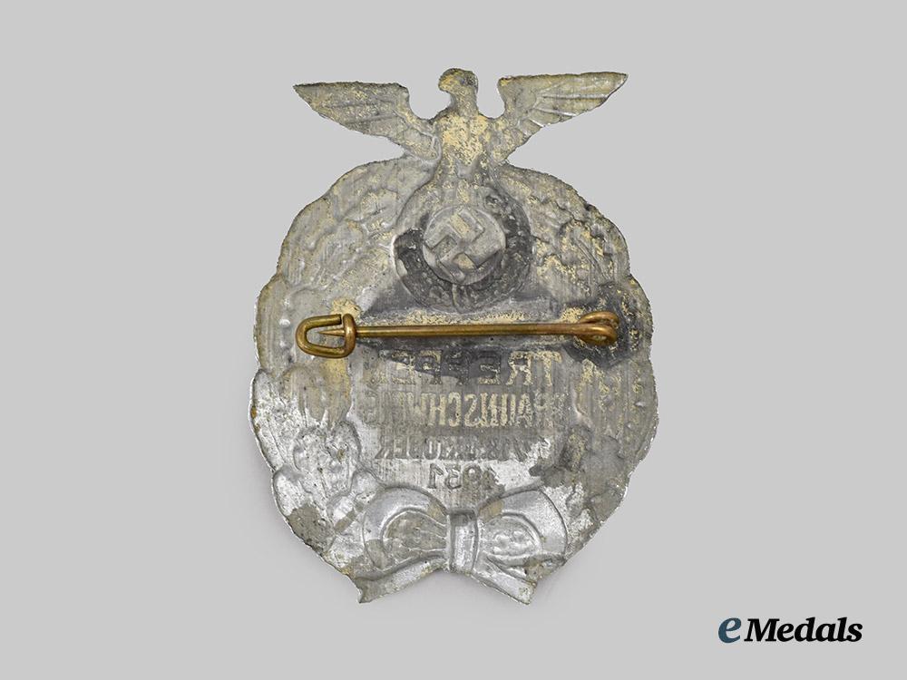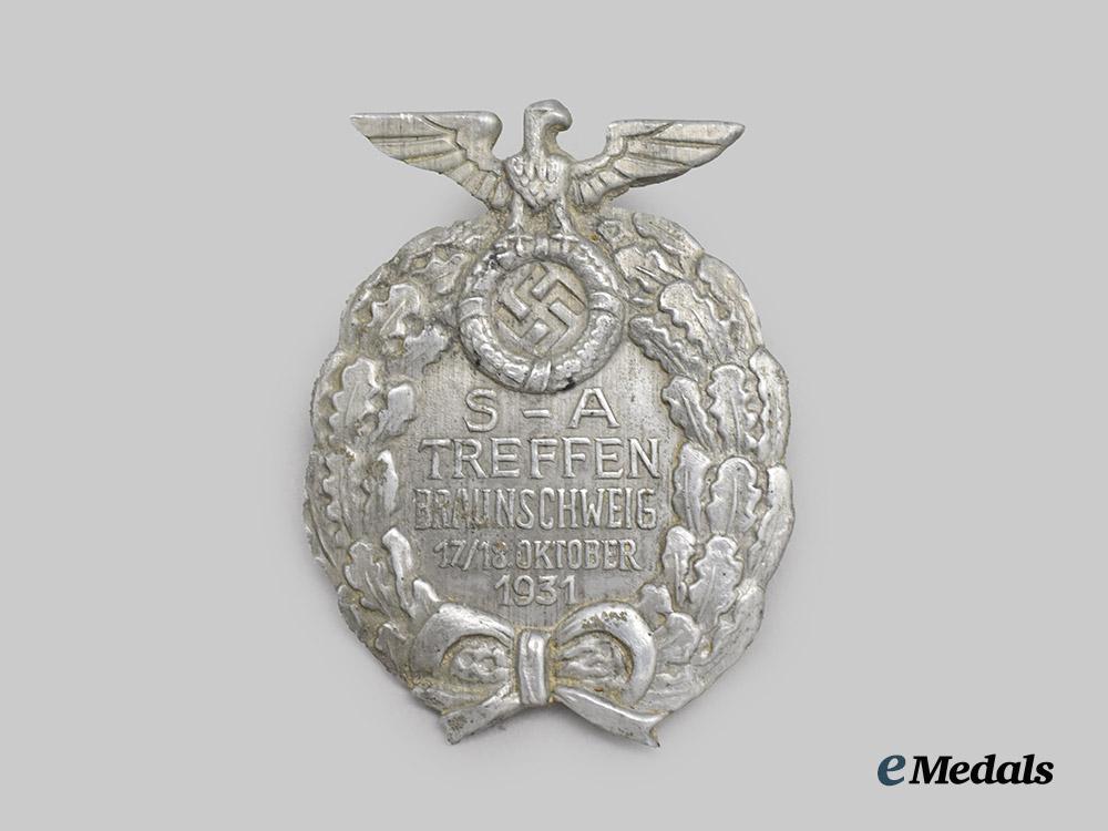 (Das Abzeichen vom SA – Treffen in Braunschweig 1931, 1. Modell). Constructed of an aluminum alloy, the obverse consisting of an oval oak leaf wreath, joined together at the bottom by ribbon, topped by an SA-style German national eagle clutching a wreathed mobile swastika, surrounding a raised inscription of “SA TREFFEN BRAUNSCWHIG 17/18 OKTOBER 1931”, the reverse with a horizontal pinback, unmarked, measuring 37 mm (w) x 50 mm (h), demonstrating some loss of finish and surface oxidation to the badge metal, in better than very fine condition.