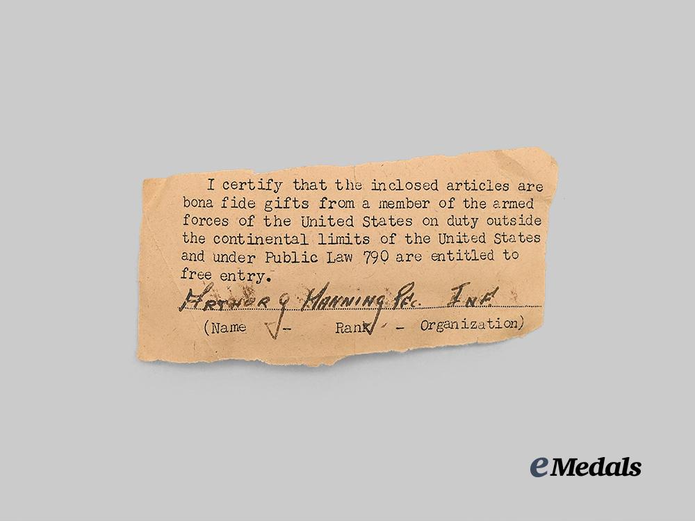 (Insignien). A mixed lot of insignia accompanied by a paper slip filled out by Private First Class Arthur G. Manning, a United States Army Infantry serviceman, indicating that Manning imported the items as war souvenirs, including: