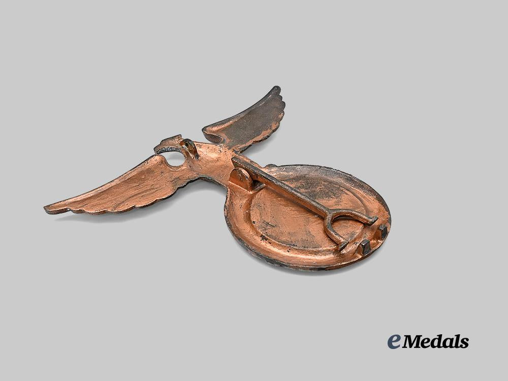 (Tisch Adler). Constructed of coppered magnetic iron, the obverse consisting of an elaborate NSDAP-style German national eagle perched on top of a wreathed mobile swastika, the reverse with an integral hinge and retractable kickstand, the latter holding the eagle upright in conjunction with two studs which emanate from the reverse of the wreath, unmarked, measuring 24 cm (w) x 19.5 cm (h), demonstrating moderate loss of finish throughout the base metal, a striking example of patriotica in better than very fine condition.