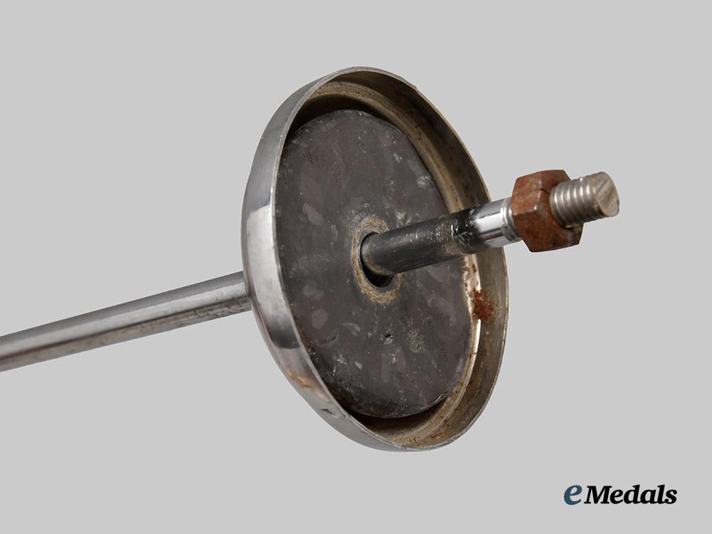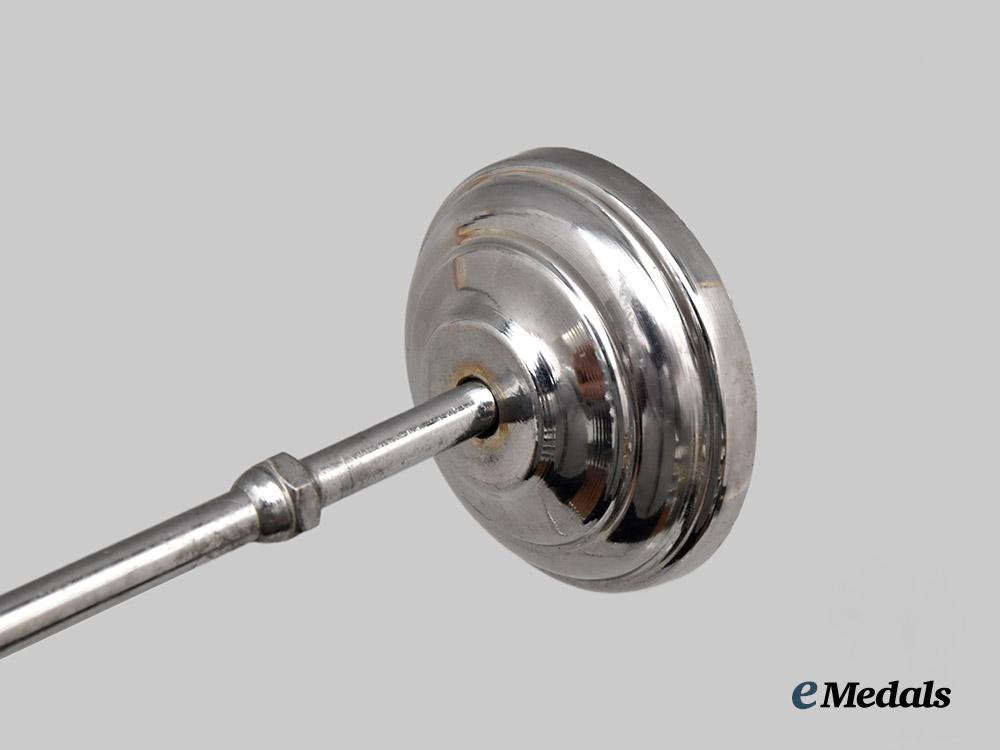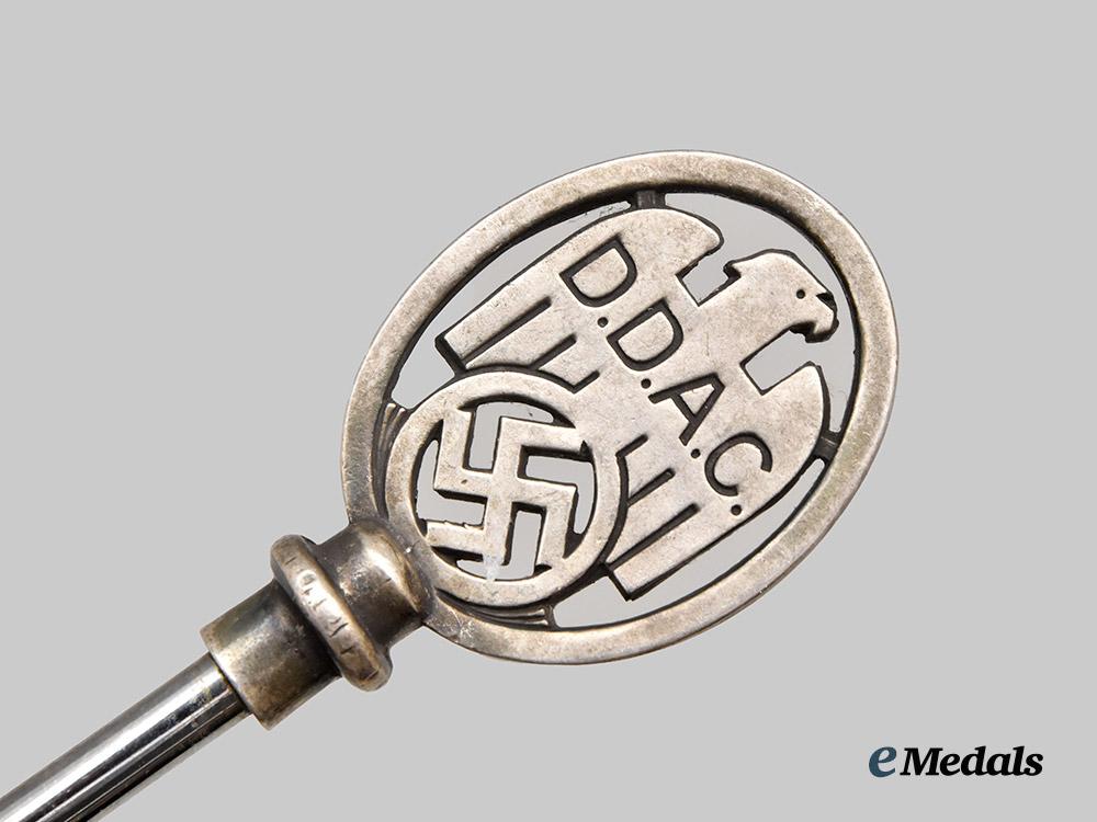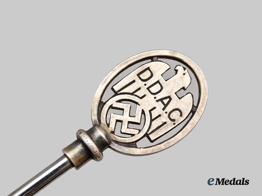 (Wimpelstange für Dienstfahrzeuge des Deutsche Automobil-Club). Constructed of a nickel-plated non-magnetic metal pole measuring 62 cm in length, culminating in threaded screwposts at both the top and bottom, the top affixed with a silvered Der Deutsche Automobil-Club (German Automobile Club/DDAC) finial measuring 38 mm (w) x 62 mm (h) (inclusive of base), the bottom retaining both an original nut and cascading multi-piece base, unmarked, demonstrating minor scratching to the base metal, a rare example for the accommodation of a service vehicle fender pennant in extremely fine condition.