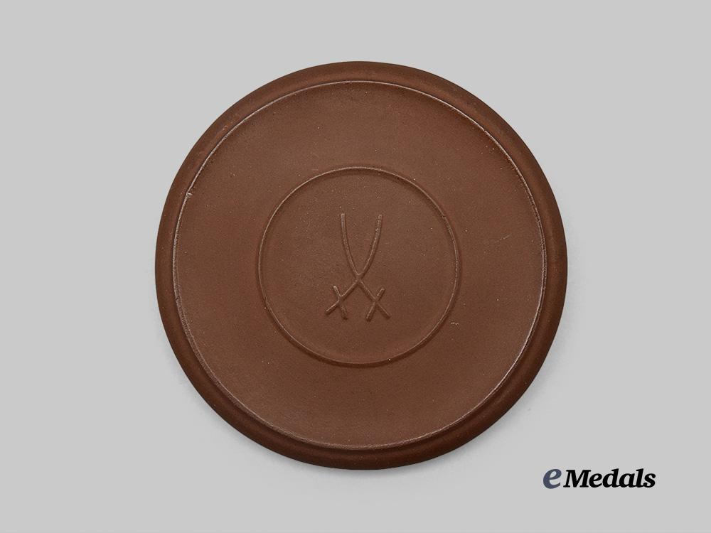 (AH Erinnerungsmedaille). Constructed of brown porcelain, the obverse bearing a raised and rightward-facing profile of AH, the reverse bearing the raised logo of the noted Meissen Porcelain factory, measuring 7.5 cm in diameter, in extremely fine condition.