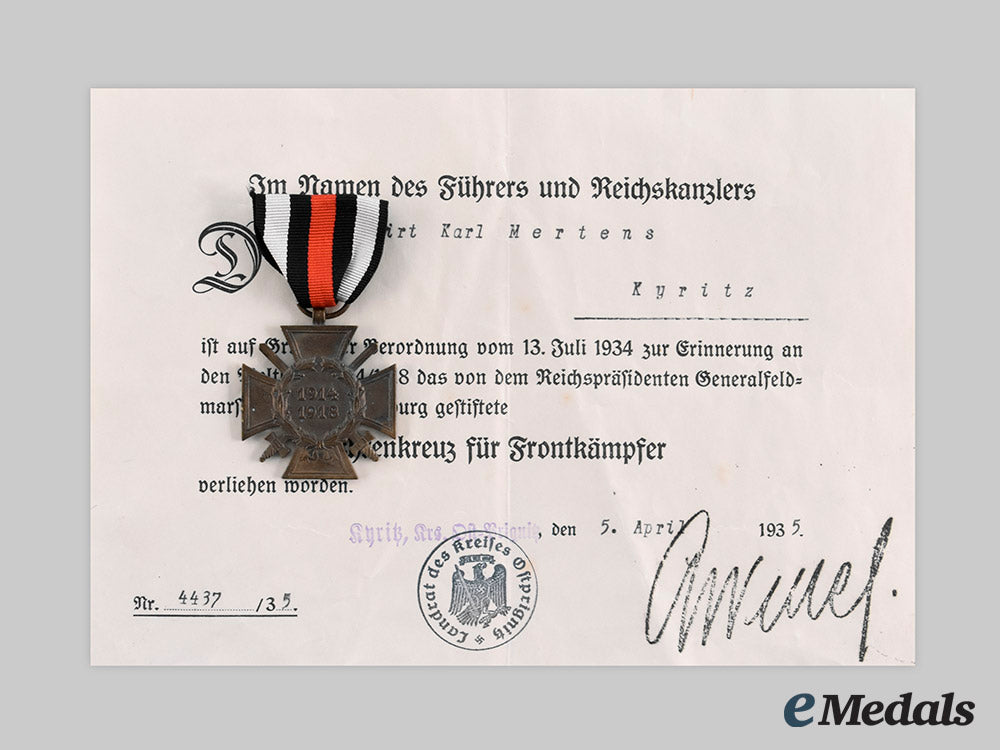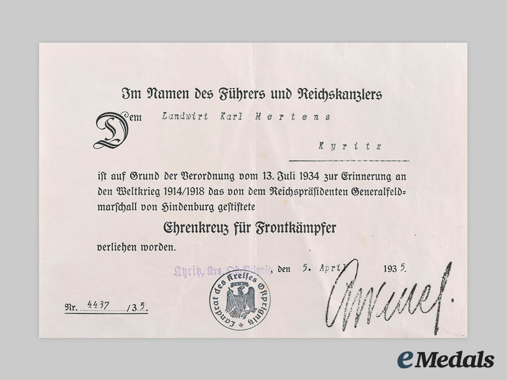 An Honour Cross of the World War 1914/1918 Award Document, on cream-coloured paper, awarded to the farmer Karl Mertens in Ostprignitz on 5 April 1935. The document is numbered “Nr. 4436/35”, stamped and signed. Presenting a single folding crease, with creasing throughout. Measuring 211 mm (w) x 149 mm (h), in overall extremely fine condition.