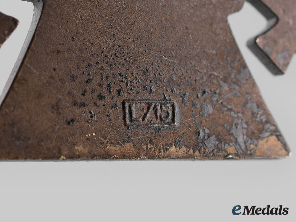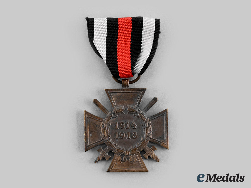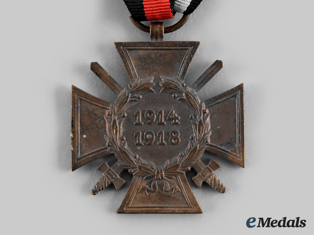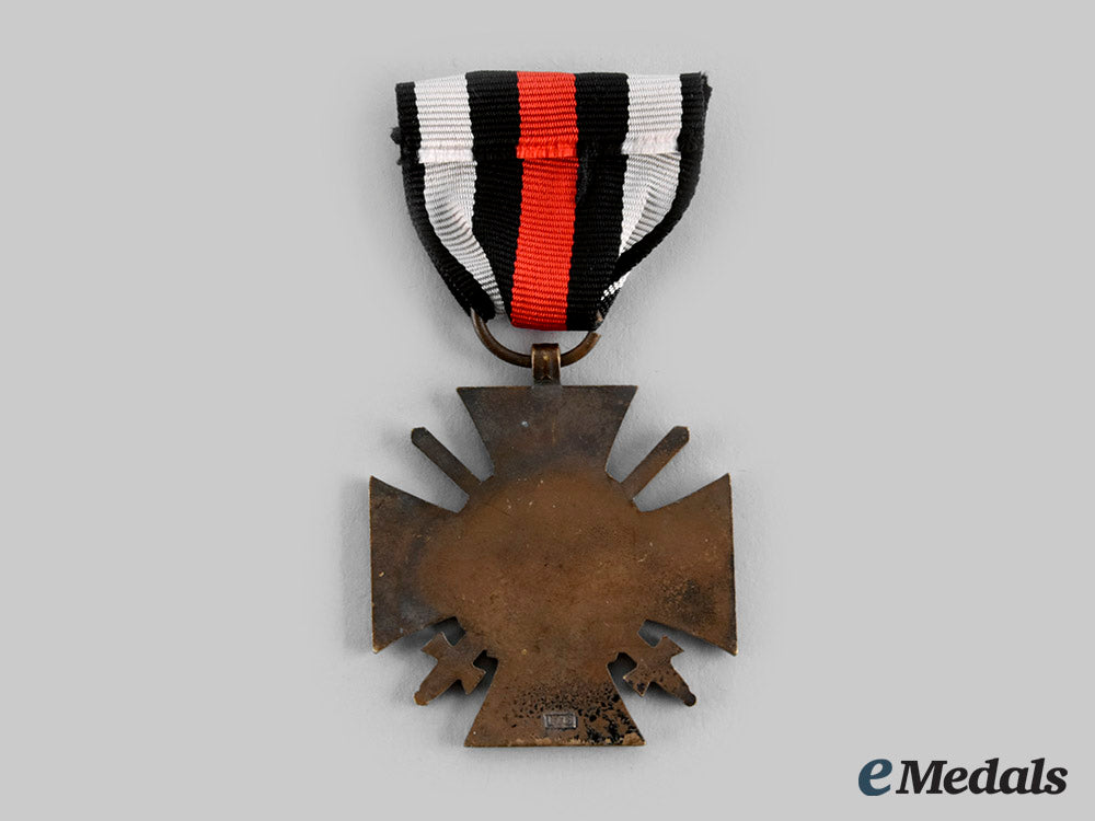 (Ehrenkreuz des Weltkriegs 1914/1918). An iron cross paty constructed of bronzed magnetic metal, the obverse centre bears the dates “1914 1918” encompassed by a laurel wreath tied with a ribbon at the bottom, two upwards facing crossed swords lay in the quadrants between the arms, the reverse is plain and marked “L/15”, with loop for suspension on a red, black and white striped ribbon, measuring 38.03 mm (w) x 42.41 mm (h), weighing 16.4 grams, very fine.