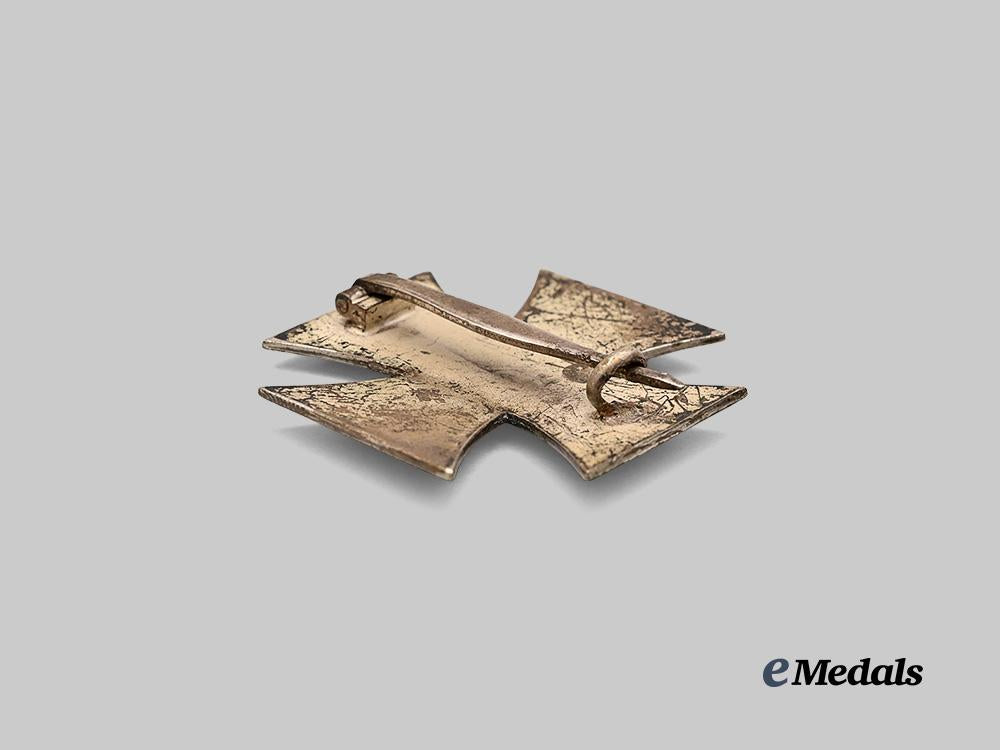 (Eisernes Kreuz 1939 I. Klasse mit Etui). Reinstituted 1 September 1939. (1939-1945 issue). Constructed of iron and silver, consisting of a Cross Pattée with a blackened magnetic iron core within a ribbed silver frame, the obverse with a central mobile swastika, the six o’clock arm with a reinstitution date of “1939”, the reverse with a block hinge and tapering vertical pinback meeting a round wire catch, unmarked but demonstrating the characteristics of manufacture by Paul Meybauer, Berlin, measuring 43.96 mm (w) x 43.80mm (h), weighing 15.9 grams, accompanied by its original presentation case, constructed of a pressed card stock frame with a faux black leather exterior liner, the lid bearing a silvered Cross Pattée, the interior with a white rayon lid liner and intact hinge cover, with a slotted off-white velvet medal bed, closing with a functional metal spring catch with exterior stud release, measuring 65 mm (w) x 65 mm (l) x 22 mm (h), demonstrating some loss of finish to the frame of the cross with bubbling of the core paint, in better than very fine condition.