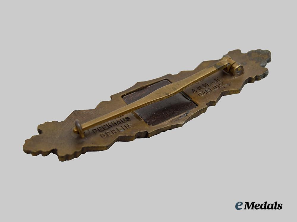 (Nahkampfspange in Bronze). Constructed of bronzed zink, the obverse consisting of a central square oak leaf wreath, topped by a Wehrmacht eagle clutching a mobile swastika, situated above a crossed bayonet and stick grenade, overlaying a magnetic metal backplate, flanked on each side by four rays and four oak leaves with two acorns, the reverse with an integral hinge and banjo-style pinback meeting a round wire catch emanating from a crimped base, designer marked “W.E. PEEKHAUS, BERLIN”, maker marked with the logo of Arbeitsgemeinschaft Metall und Kunststoff, Berlin, measuring 97.92 mm (w) x 26.70 mm (h), weighing 34.6 grams, demonstrating minor loss of finish to the sides in addition to a mis-placed crimp stamp to the right side of the backplate resulting in an indent, an exceptionally well-preserved zink example in extremely fine condition.