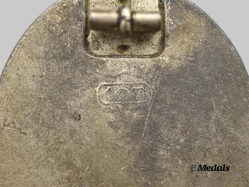 3. A Silver Grade Wound Badge, constructed of silvered zink, the obverse consisting of an oval laurel leaf wreath, joined together at the bottom by ribbon, with a central raised Stahlhelm overlaid by a mobile swastika, on top of crossed swords on a pebbled field, the reverse with a crimped hinge and vertical pinback meeting a round wire catch emanating from a rectangular plate, maker marked with Präsidialkanlzei code “107” for Carl Wild, Hamburg, measuring 36.71 mm (w) x 44.20 mm (h), weighing 25.3 grams, demonstrating minor loss of finish, in better than very fine condition.