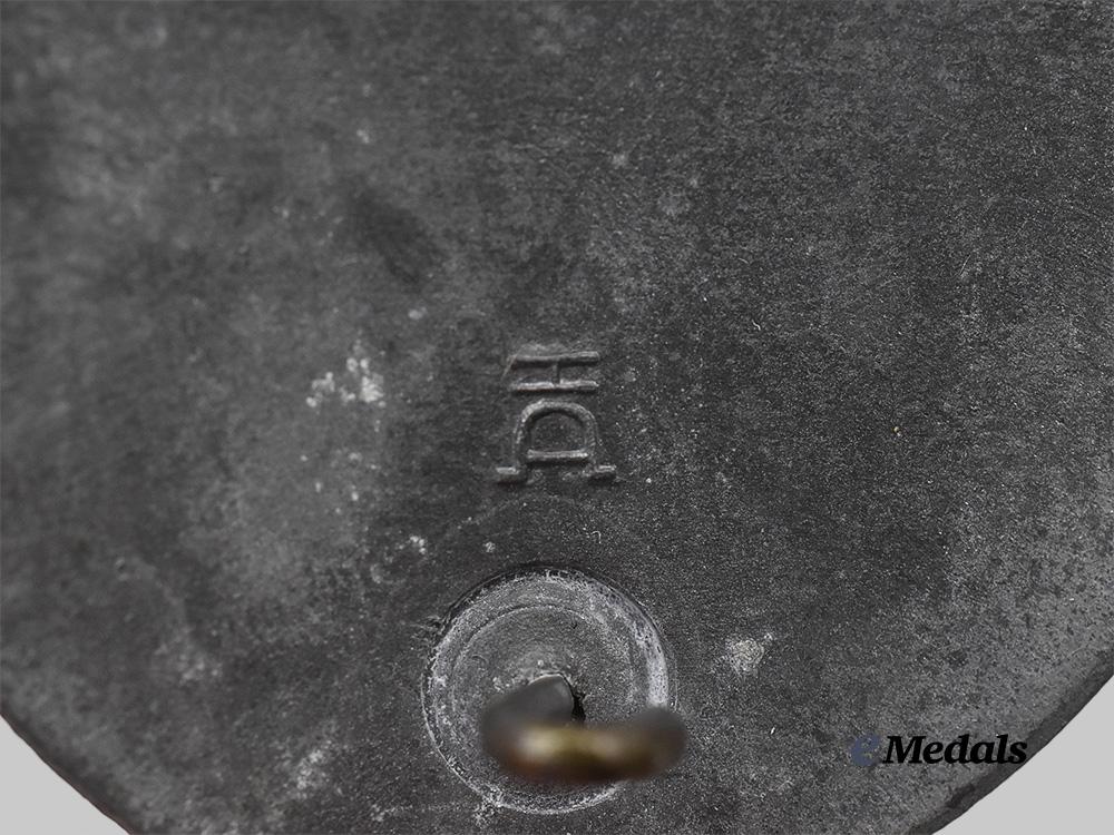 (Panzerkampfabzeichen in Silber). Constructed of silvered zink, the obverse consisting of an oval oak leaf wreath, joined together at the bottom by ribbon, topped by a Heer-style German national eagle clutching a mobile swastika, surrounding a central Panzer IV rolling over grassy terrain, with its left tread extending beyond the edge of the wreath, the reverse with a crimped barrel hinge and vertical pinback meeting around wire catch emanating from a crimped base, maker marked with the logo of Hermann Aurich, Dresden, measuring 41.68 mm (w) x 60.00 mm (h), weighing 29.6 grams, demonstrating loss of silver finish throughout the base metal, in near extremely fine condition.