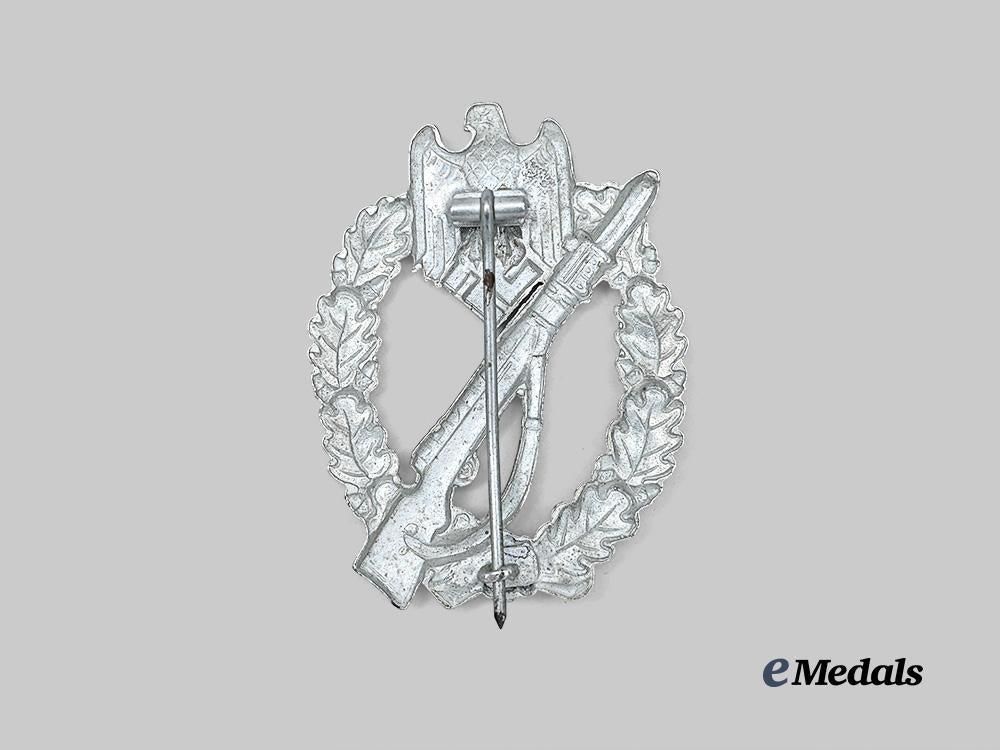 (Infanterie-Sturmabzeichen in Silber). Constructed of stamped and silvered magnetic steel, the obverse consisting of an oval oak leaf wreath, joined together at the bottom by ribbon, topped by a Heer-style German national eagle clutching a mobile swastika, diagonally across the badge is a Karabiner 98k rifle with the bayonet attached and the carrying sling hanging from the rifle, the reverse with a crimped hinge and vertical pinback meeting a round wire catch emanating from a rectangular plate, unmarked but demonstrating the characteristics of a documented and unusual variation produced by an unidentified manufacturer, measuring 47.05 mm (w) x 62.11 mm (h), weighing 21.4 grams, a rare badge in near mint condition.