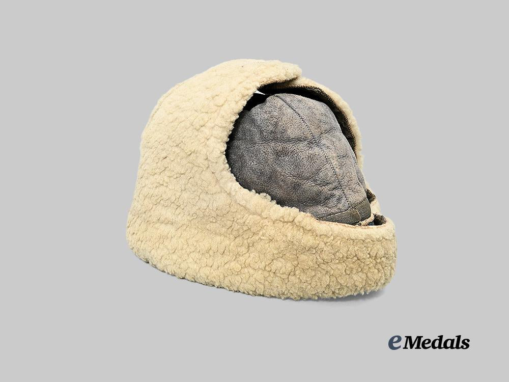 (Wehrmacht Wintefellmütze). An unusual and well-preserved Wehrmacht/SS winter field cap, constructed of a dark blue dyed calf skin base, surrounded by low-set side walls and ear flaps lined in white wool, the latter rolling up and fastening in place over the crown with a functional metal snap button, the interior fully lined in identical wool, unmarked, measuring 22 cm (w) x 26 cm (l) x 16 cm (h) as configured for wear, demonstrating minor soiling and material fatigue, an interesting example of an unofficial winter cap worn by Wehrmacht and SS personnel and loosely modelled after the Russian ushanka, in near extremely fine condition.