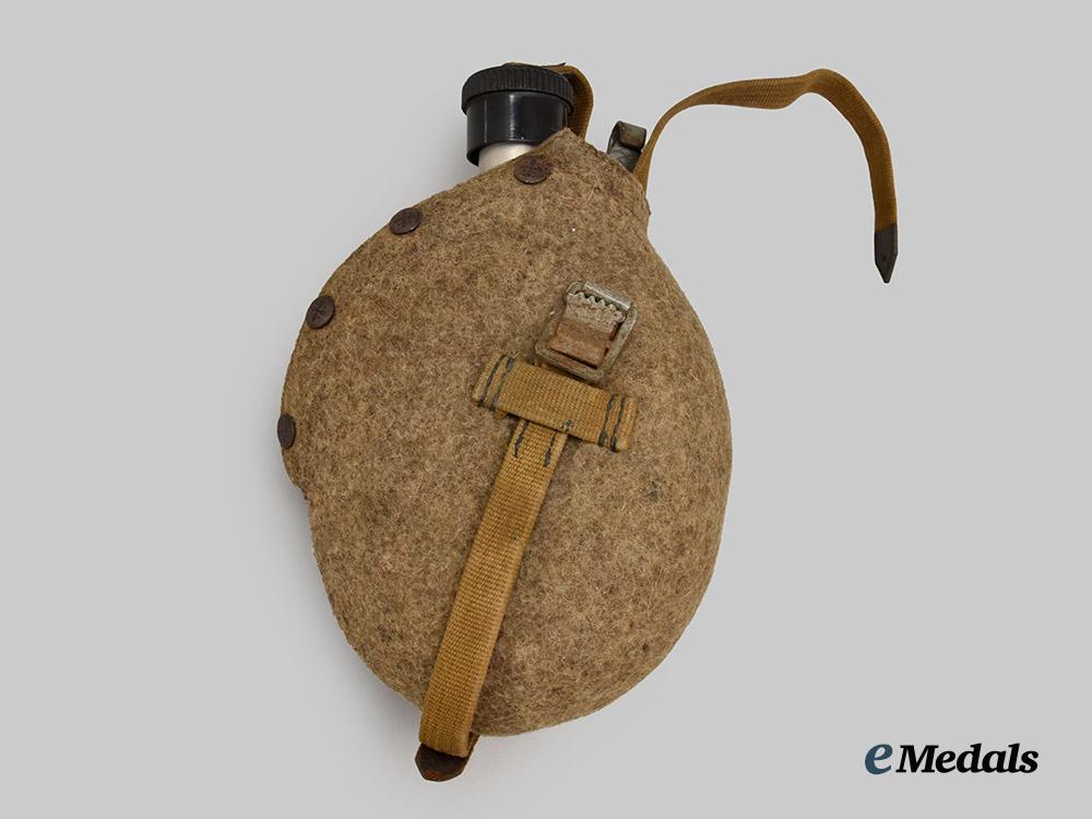 (Feldflasche M31). Constructed of an aluminum shell, featuring a threaded spout which retains a black bakelite cap, the latter topped by a rivet which connects to cotton straps affixed to an original field-grey felt cover, the obverse of the shell notably bearing a hand-painted depiction of Hohensalzburg Fortress, situated above a banner bearing an inscription of “SALZBURG - AUSTRIA”, topped by a name of “LEROY E. JOHNSON” with the classic rainbow insignia of the US 42nd Infantry Division (appropriately then on occupation duty in Austria), the reverse bearing a central coat of arms situated above a depiction of the Combat Infantryman Badge, topped by a banner bearing a date of “JANUAR - 1946”, flanked on the sides by flowers, the spout stem maker marked with the logo of Franzel & Sachs, Schneeberg, measuring 13.5 cm (w) x 21 cm (h), oxidation is visible to the metal buckles and buttons on the cover and friction renders removal of the cap difficult, a superb example of a veteran-attributed battlefield souvenir in near extremely fine condition.