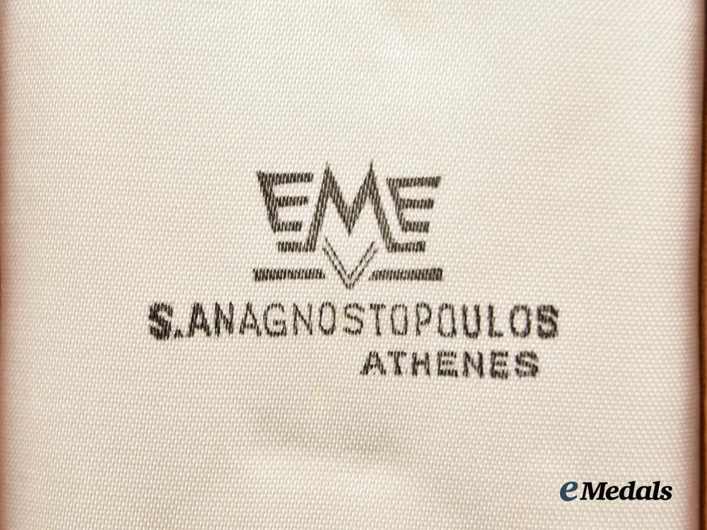 (Τάγμα του Φοίνικος Αργυρούς Σταυρός) Order of the Phoenix Member or Silver Cross. Three piece construction. A white-enameled cross, in silver, with a Phoenix at the centre. A five-pointed star is at the upper arm of the cross. Monarchy 1935–1973 type with a crown suspension, the orders reverse side features the monogram of the King Paul II 1947-1964. No damage to the enamel. In fine condition. With its original ribbon in excellent shape and a pin attachment in the back. With its original case of issue featuring a golden phoenix within a golden border. The case is marked "S. Anagnostopoulos Athenes" The case is in good condition.