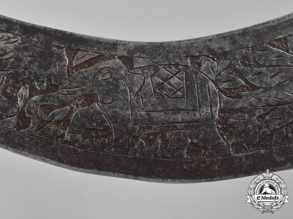 This jambiya has a 280 mm long double-edged steel blade, magnetic, with sharpened edges and having a dull tip, the blade beautifully engraved with a distinctive floral motif and incorporating icons on both sides, the one side with a figure in traditional Indian dress, the other side with a tiger and an elephant facing head-to-head, the blade embedded into a steel handle, which is also magnetic, each side with a floral motif within an ornate border, the oval pommel end with a leafing pattern, measuring approximately 65 mm wide x 380 mm in length, very fine.