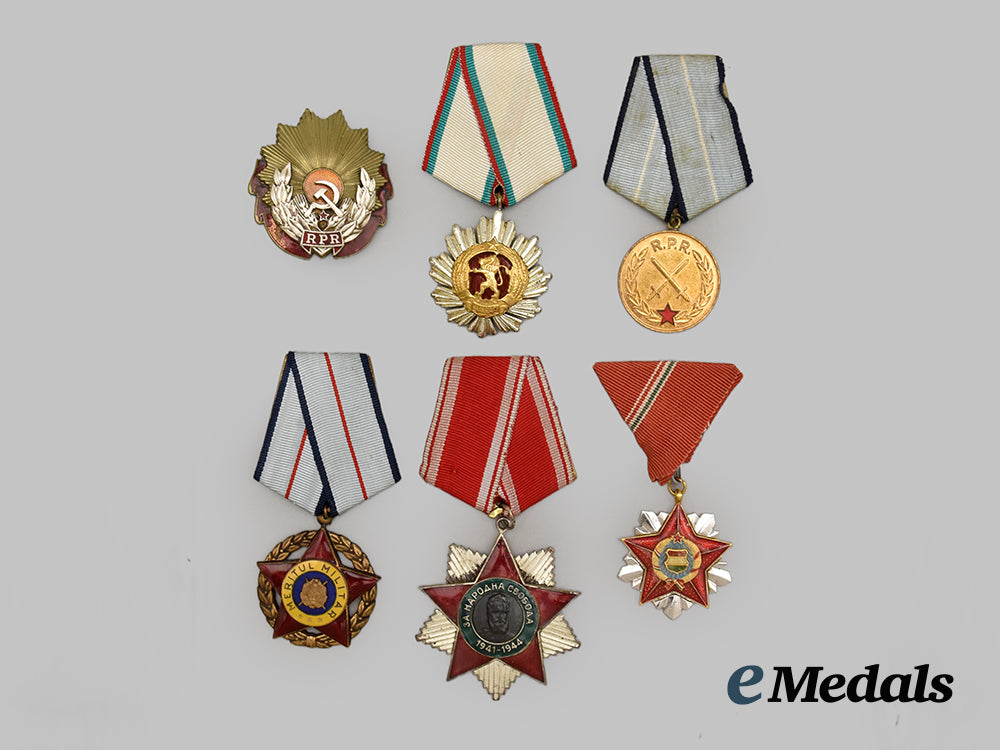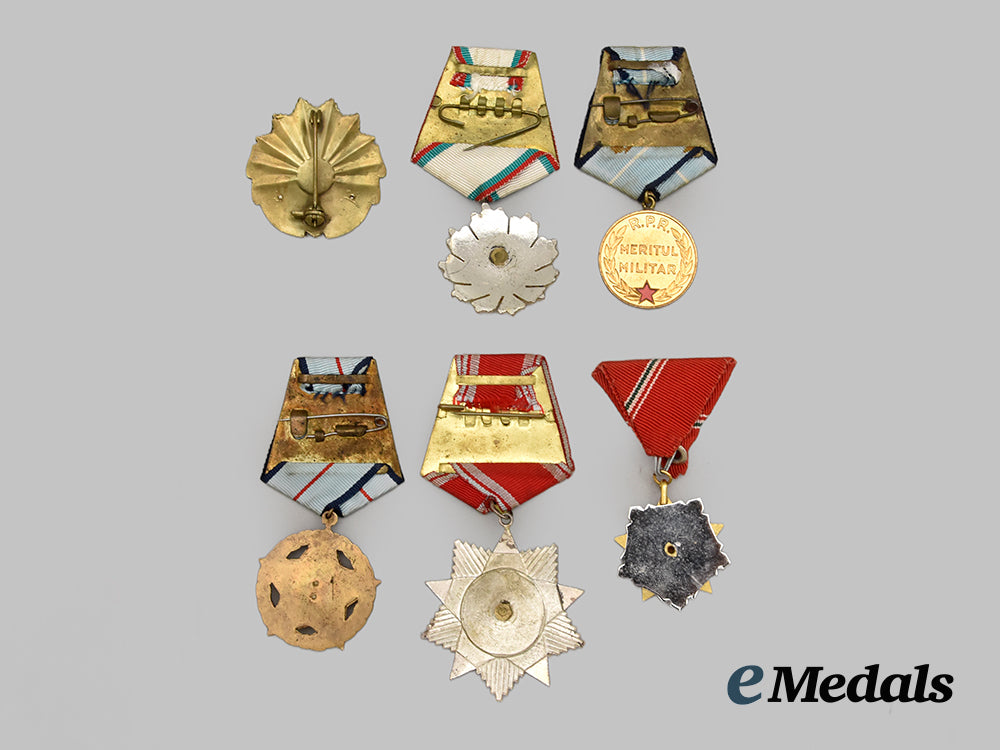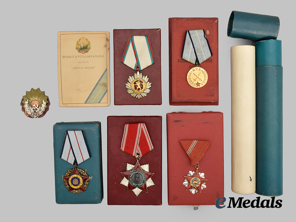 1.Romania, People’s Republic. An Order of Military Merit, III Class, Awarded to Ancuța Gh. Vasile. Five-point star in red enamel, surmounted on a gilded wreath, obverse center bearing the emblem of the Socialist Republic of Romania on a blue enameled background, surrounded by inscription MERITUL MILITAR on a yellow enameled background, on original pentagonal mount, 38.4 mm, evidence of scratches on reverse, extremely fine condition. Housed in the green box of issue, does not close properly, fine condition. Housed in a green scroll case is the document authenticating the medal’s recipient as Lieutenant Colonel Birzu Ioan Mihail.