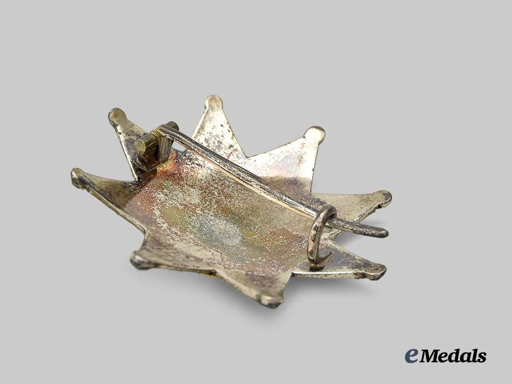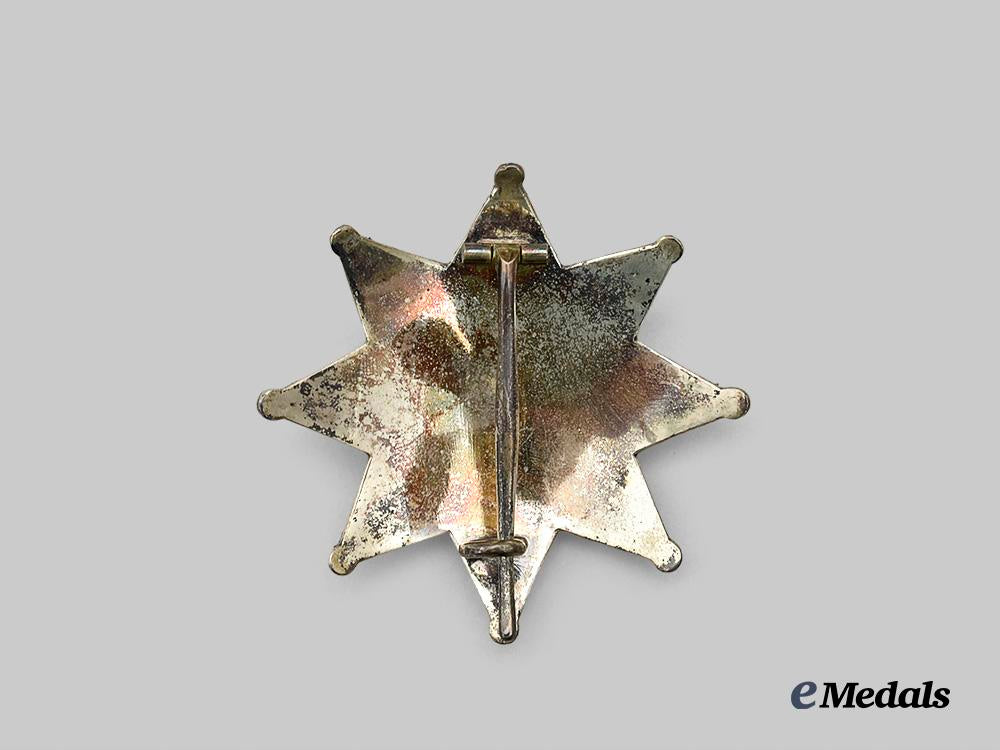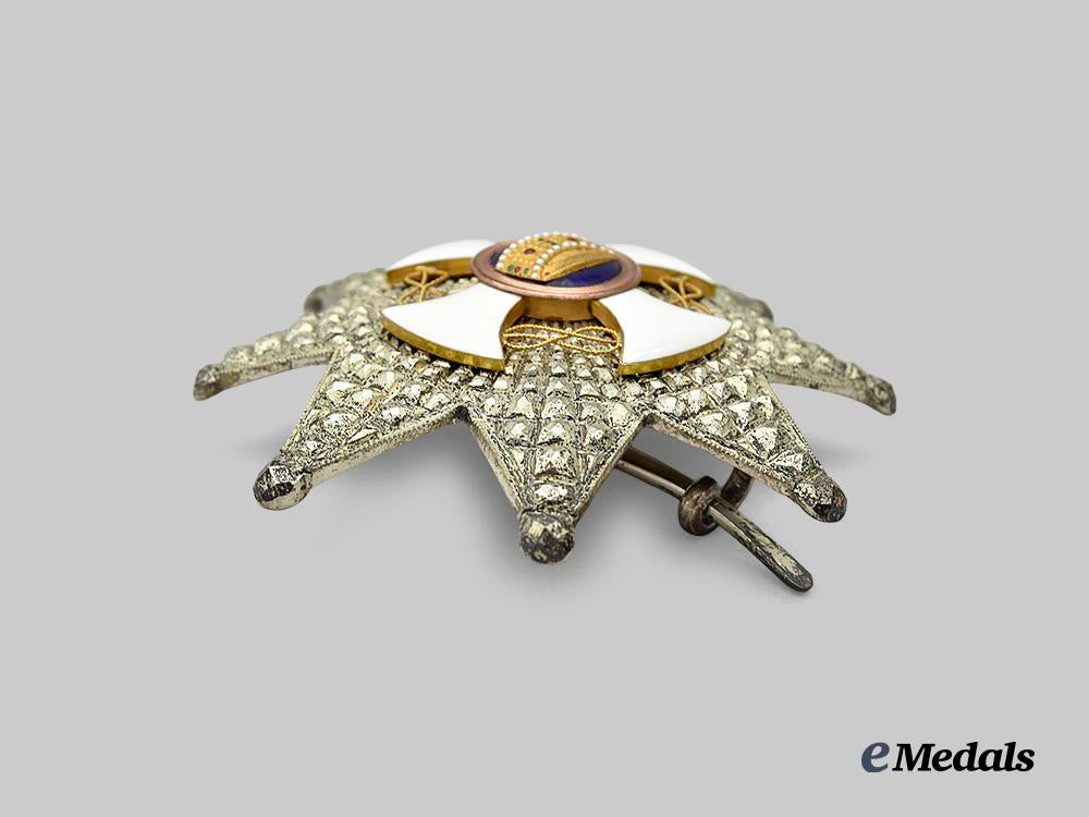 The Breast Star, in silver, featuring eight faceted arms with large ball finials, the central medallion presenting the white enamel cross with Savoy knots in the quadrants, the lombardy crown on a blue enamelled field encircled by a Gold ring, the reverse of the star presenting a vertical pin assembly, unmarked, measures 72.7 mm (w) x 71.1 mm (h), weighs 56.9 grams, wear to silver, enamels intact, hinge and clasp functional, extremely fine.
