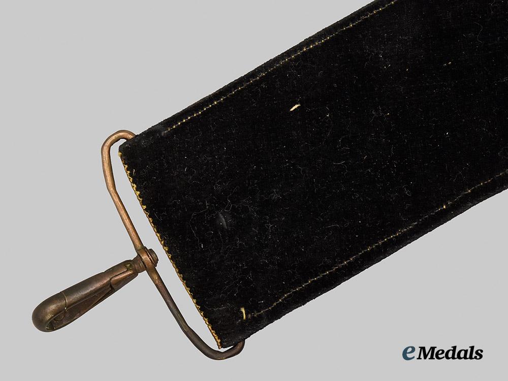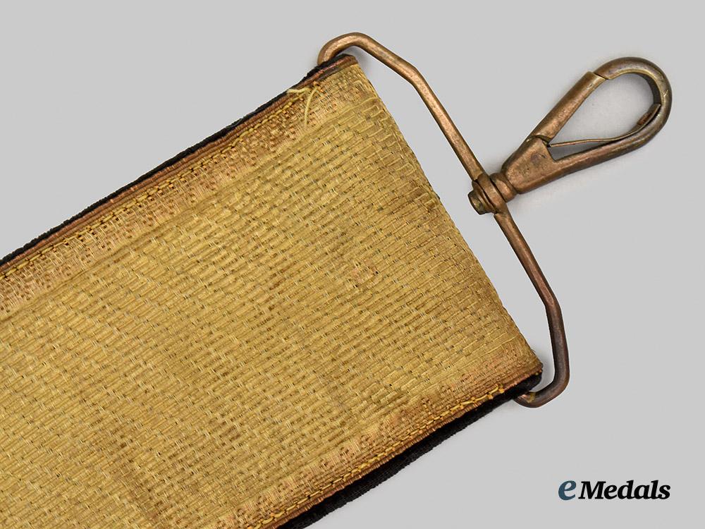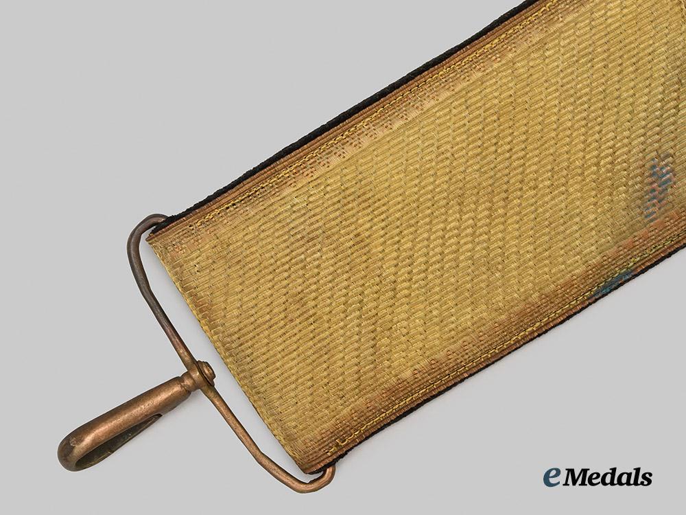 Belt consists of two pieces, each with a gold-coloured bullion wire upper, herringbone pattern design incorporated in the centre, the edges trimmed in a repeating v-shaped pattern, the uppers stitched in place upon black felt backers, each piece with a synthetic core, two insignias affixed to the belt's upper that appears on the wearer's front, a 67.5 mm x 106 mm silvered zinc crowned eagle with raised wings and a shield bearing a cross upon its chest, a 58.5 mm x 107.5 mm shield consisting of a two-piece construction, with a bronze crowned cypher of King Victor Emmanuel III of Italy affixed to a silvered die-stamped metal shield outlined in oak leaves and acorns, with roses in the two upper corners of the shield, two large feather-tailed arrows protruding from the top of the shield, the two insignias linked by two chains incorporating multiple figure-eight knots. The part of the belt that appears on the wearer's back has two 73 mm x 96.5 mm silvered die-stamped metal crescent-shaped brackets outlined in oak leaves and acorns, with roses at either end facing each other, 72 mm x 75 mm butting silvered die-stamped insignias underlying the brackets, consisting of a single matching crescent-shaped bracket outlined in oak leaves and acorns, with roses at either end butting a rectangular bracket incorporating a floral motif, loops with bronze spring-loaded clips placed at either end, the belt measuring 63 mm x 1,050 mm. The synthetic core has been exposed on the shorter piece of the belt and has become brittle and fragmented, scattered silvering wear evident on the metal parts, wear present on the felt backer, light soiling on the upper and separation of belt from buckle, Fine.