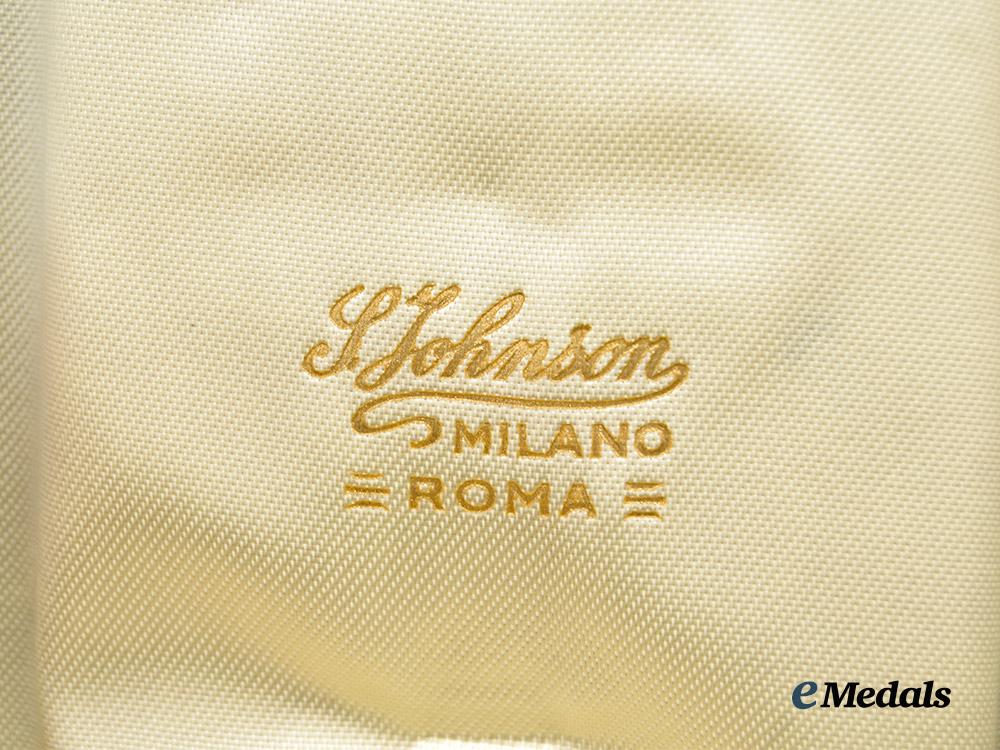 (Ordine al Merito della Repubblica Italiana, Cavaliere Ordine al Merito della Repubblica Italiana ) Order of Merit of the Italian Republic V Class Knight, Instituted in 1951. Three-piece construction, in silver with red, white, green and black enamels, gilt star on both sides, unmarked, measuring 44.3 mm (w) x 60 mm (h) inclusive of its crown suspension, intact enamels, original ribbon with dual prong pinback, in excellent condition. In its original box of issue market "S. Johnson MIlano Roma", case shows scuffing in the corners.