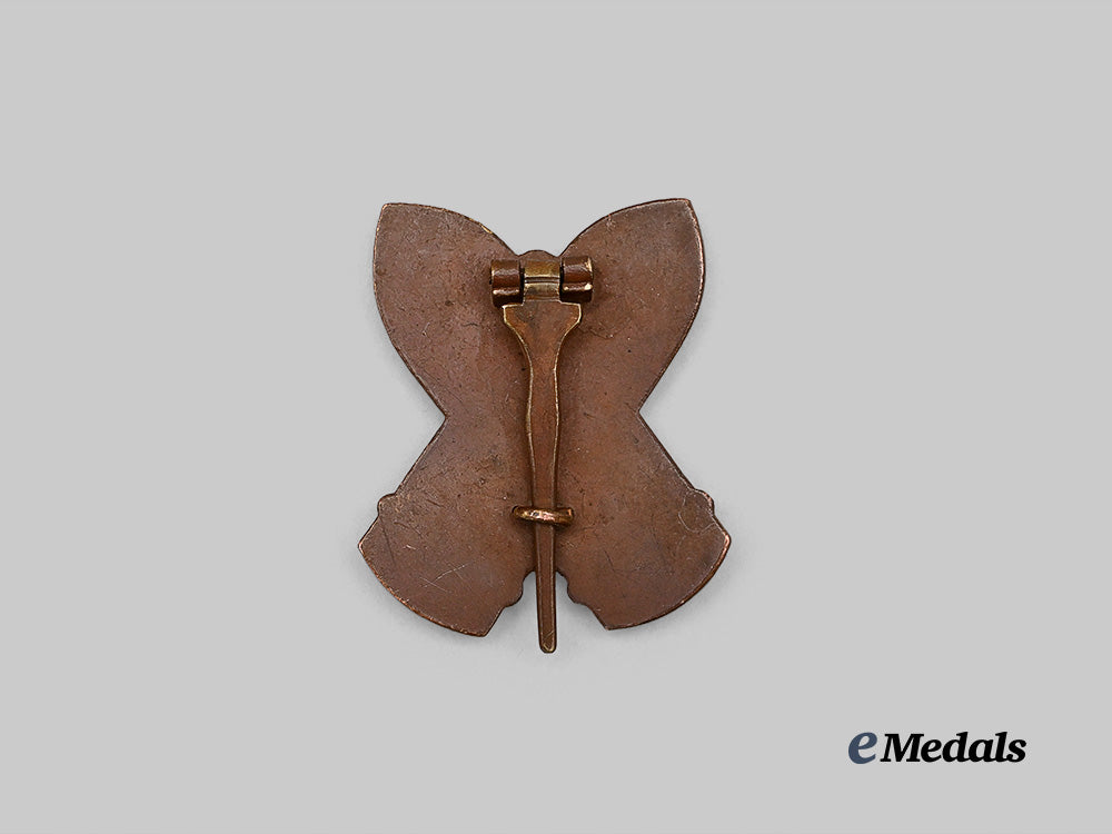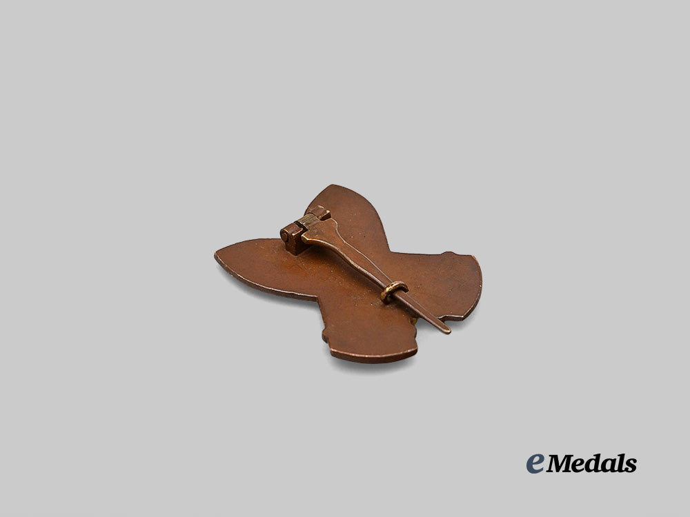 In bronze, with obverse bronze gilt details featuring an anchor and flower, the reverse offers a vertical pin, clasp has been pinched closed, measures 31.7 mm (w) x 37.2 mm (h), dark patina, very fine.