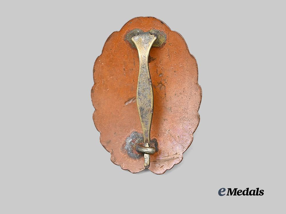 In bronze and bronze gilt, illustrating a five-pointed gilt star in the centre backed by emanating rays, framed by arching copper gilt feathered wings on either side, with chrysanthemum petals at the base of each wing, a two-bladed propeller placed horizontally at the base, measuring 35.94 mm (w) x 50.95 mm (h), with vertical pin on the reverse, overall gilt loss on the wings, contact marks, very fine.