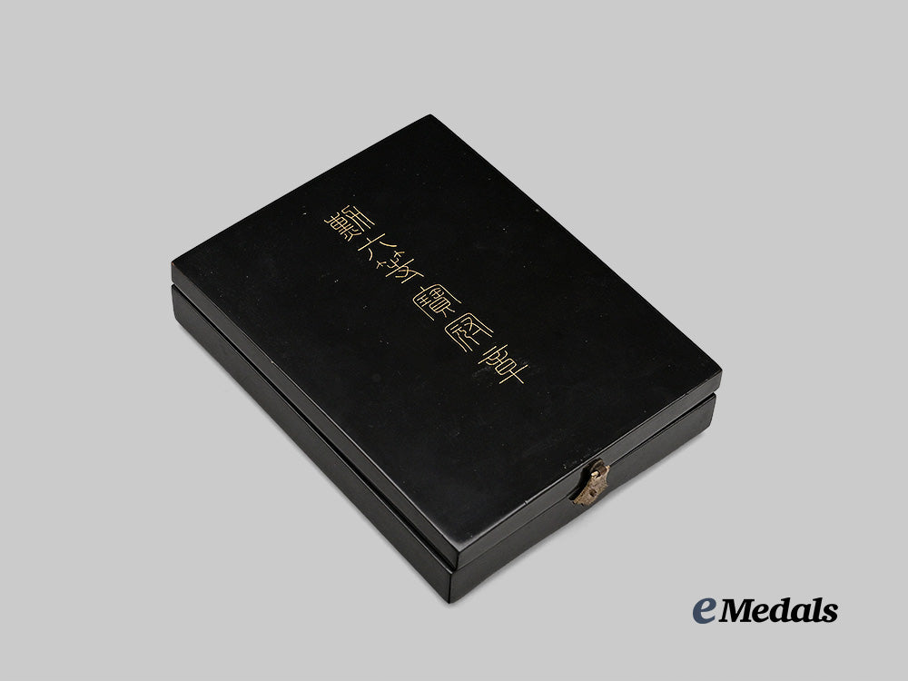 The decoration is in a case for the order (different class), a black lacquer exterior and Japanese characters, with an interior purple silk with recessed medal bed and compartment for the ribbon, hinge loose on the left side, minor wear to exterior, VI class is slightly too big for the recession in the medalbed, remains in very fine condition.
