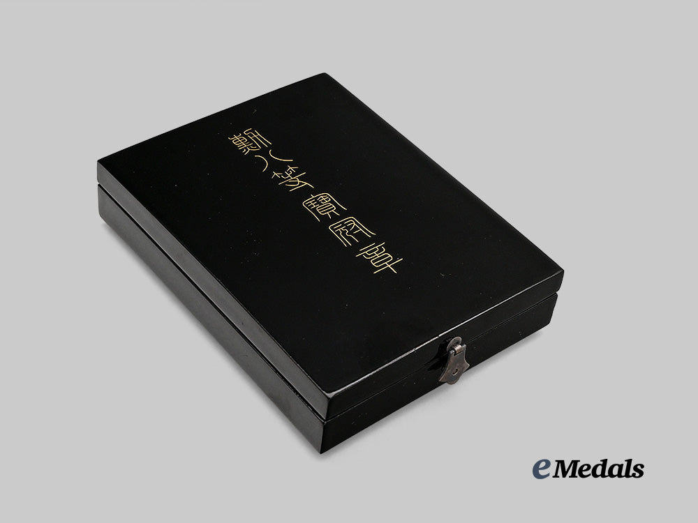 The decoration is in original case of issue with a black lacquer exterior and Japanese characters, with an interior purple silk with recessed medal bed and compartment for the ribbon, functional hinge and clasp, minor wear, remains in extremely fine condition.