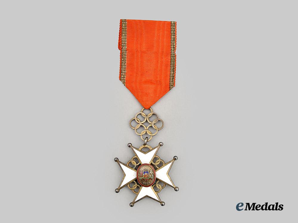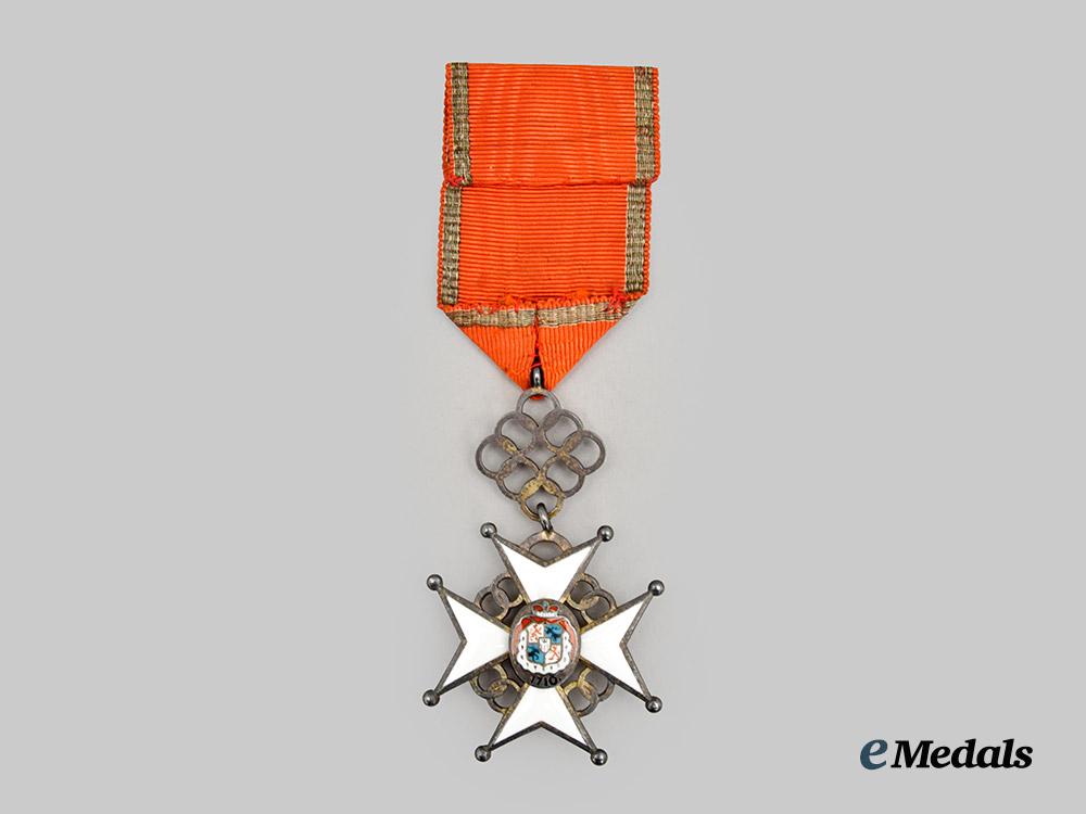 (Atzinības krusts). Instituted in 1710, Re-established in 1938. In silver gilt with red, green, light blue, dark blue and white enamels, inscribed in French "Pour Les honnêtes gens" (For Honest People) along the edges of the three lower arms, measuring 36 mm x 56 mm inclusive of its multi-interlocking ring suspension, original ribbon, intact enamels, extremely fine.
