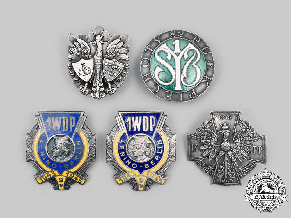 4. two 1st "Warsaw" Mechanized Division Badges (in silvered bronze with blue and yellow enamels, measuring 37 mm (w) x 43 mm (h) each, maker marked "MENNICA PANSTWOWA" on their screwbacks).