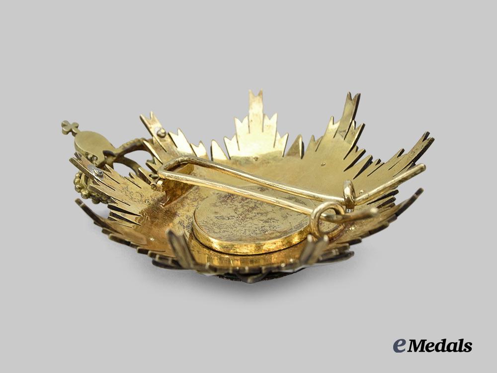 (Ordem de Nossa Senhora da Conceição da Vila Viçosa). Instituted in 1818. In silver gilt, a nine-armed star with clusters of five rays, the obverse presents a superimposed nine-arm white enamelled star with white enamelled stars in each quadrant, the obverse medallion in Gold features the cypher MA for Mary in Gold, surrounded by a blue enamel ring inscribed PADROEIRA DO REINO (Patroness of the Kingdom), surmounted by an ornate crown with red and green enamelled details along the riband, reverse plain, measures 65.5 mm (w) x 87.3 mm (h), worn on full length sash with large rosette, gilt wear on crown, enamels intact, in extremely fine condition.