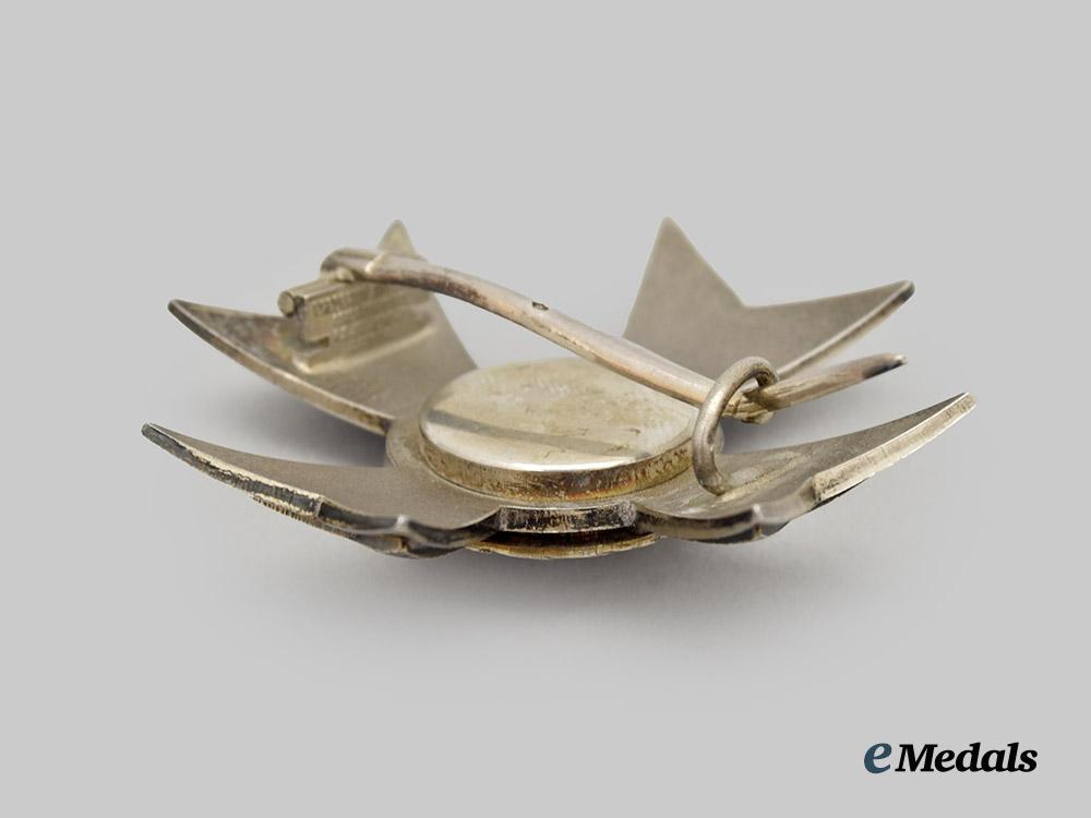 (Ordem do Mérito). The sash badge, a multi-piece construction, silver gilt with blue, white and red enamels, the obverse features a central five point star on a blue field encircled by the white ring inscribed BEM MERECER, the reverse features the coat of arms of Portugal and surrounded inscription REPUBLICA PORTUGUESA, suspending laurel wreath and elongated loop with floral designs, measuring at 52.2 mm (w) x 81.7 mm (h- inclusive of its wreath suspension), marked on wreath suspension and loop with silver mark, worn on a replacement near correct sash badge, enamels intact, minor wear, extremely fine.