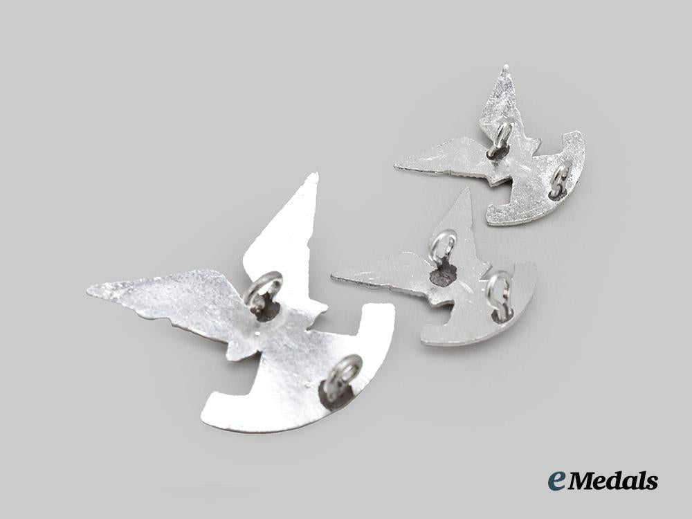2. A pair of collar badges, each constructed of anodized aluminum and retaining both lugs, both unmarked but demonstrating the characteristics of manufacture by Reuteler of Salisbury, each measuring 27 mm (w) x 25 mm (h), in extremely fine condition.