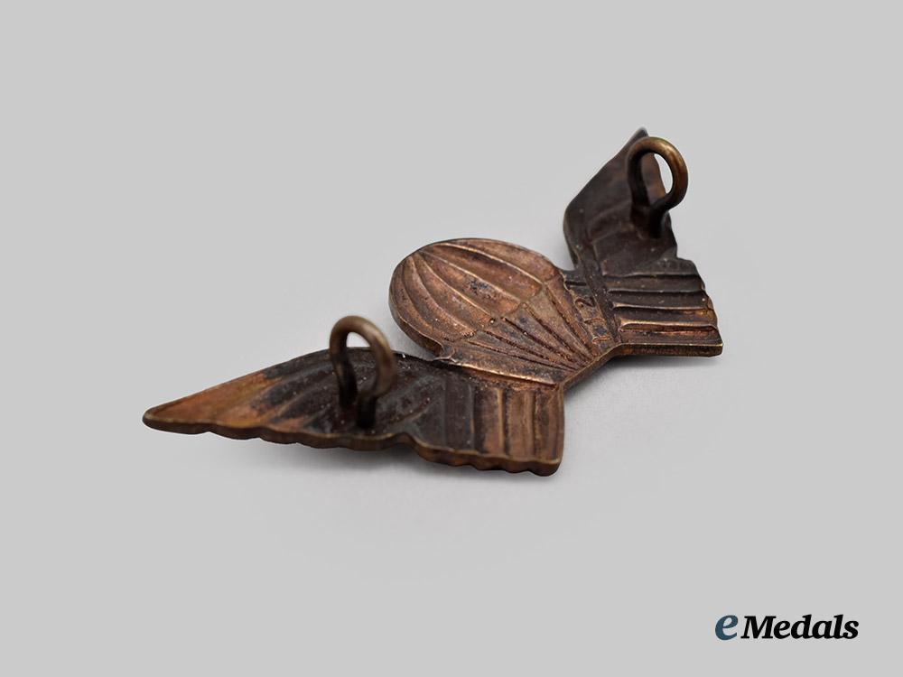 Constructed of bronze, the obverse consisting of a central parachute flanked by a pair of wings, the reverse retaining both lugs, stamped with an issue number of “1157”, unmarked but demonstrating the characteristics of manufacture by Reuteler of Salisbury, measuring 65 mm (w) x 26 mm (h), demonstrating some loss of finish, an unissued Bush War-period example in near extremely fine condition.