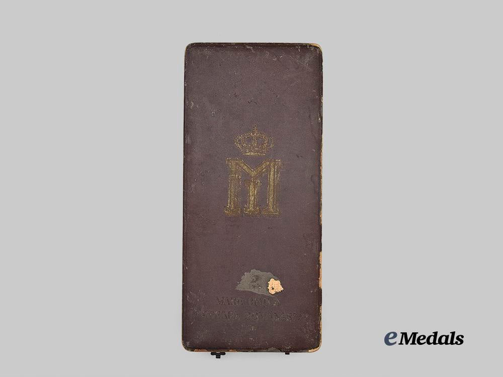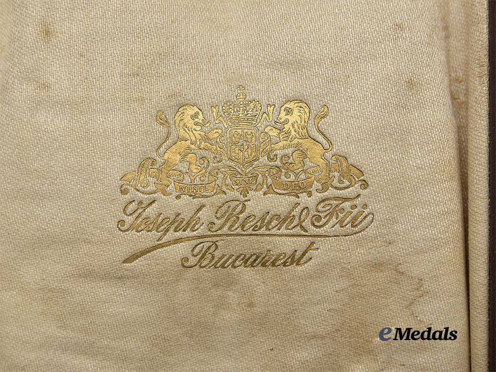 In the original case of issue, a brown leatherette exterior with Romanian cypher of Michael I and marked “MARE OFITER STEAUA ROMANIEI CIVIL” on the lid, interior lid marked Joseph Resch Fils Bucarest, tan velvet medalbed, measures 110 mm (w) x 235 mm (l) x 43 mm (d), two clasps, both functional, wear and fatigue to the exterior, in better than fine condition.