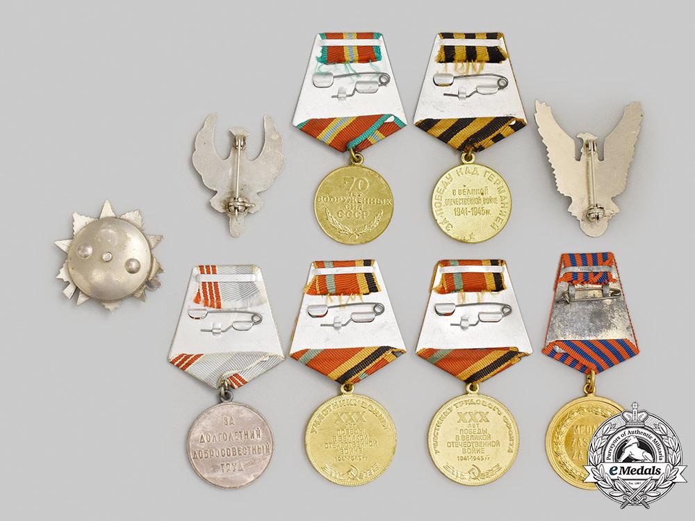 Two in silvered metal, four in brass, one in bronze, one in aluminum alloy, the two Romanian Air Force badges and the Order of the Patriotic War with intact enamels, in various sizes, original ribbons, six of which are mounted to aluminum or metal suspensions with pinbacks, one with a screwback, ranging from fine to near extremely fine.