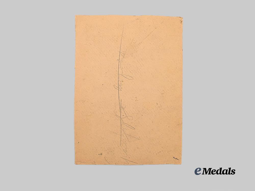 A printed portrait of Karađorđe Petrović, on stiff cardboard stock and measuring 12.5 cm x 7.5 cm, depicting the founder of modern Serbia in traditional military dress with richly detailed decorations across the chest, rendered in fine line engraving with strong contrast and period stylistic features, the lower front inscribed in ink “Karadorde.”, the reverse bearing pencil notations, the edges lightly worn consistent with age, the overall presentation characteristic of early commemorative prints honouring the leader of the First Serbian Uprising.