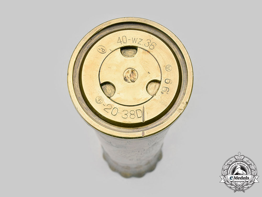 Constructed of brass, the sides bearing highly detailed etched designs consisting of Slovak Schnelle Division (Rýchla Divízia) insignia consisting of a Slovak eagle overlaid by a coat of arms and clutching a fasces, set above an inscription of “PAMIATKA Z RUSKA” (“MEMENTO OF RUSSIA”) and “KRYM” (“CRIMEA”) with a date of “11. VIII. 1943”, with the opposite side bearing Eastern Front combat scenes consistent of infantry and armoured units beneath planes dropping bombs and with paratroopers descending from the sky, the base displaying calibre markings, measuring 65 mm (w) x 226 mm (h), in extremely fine condition.