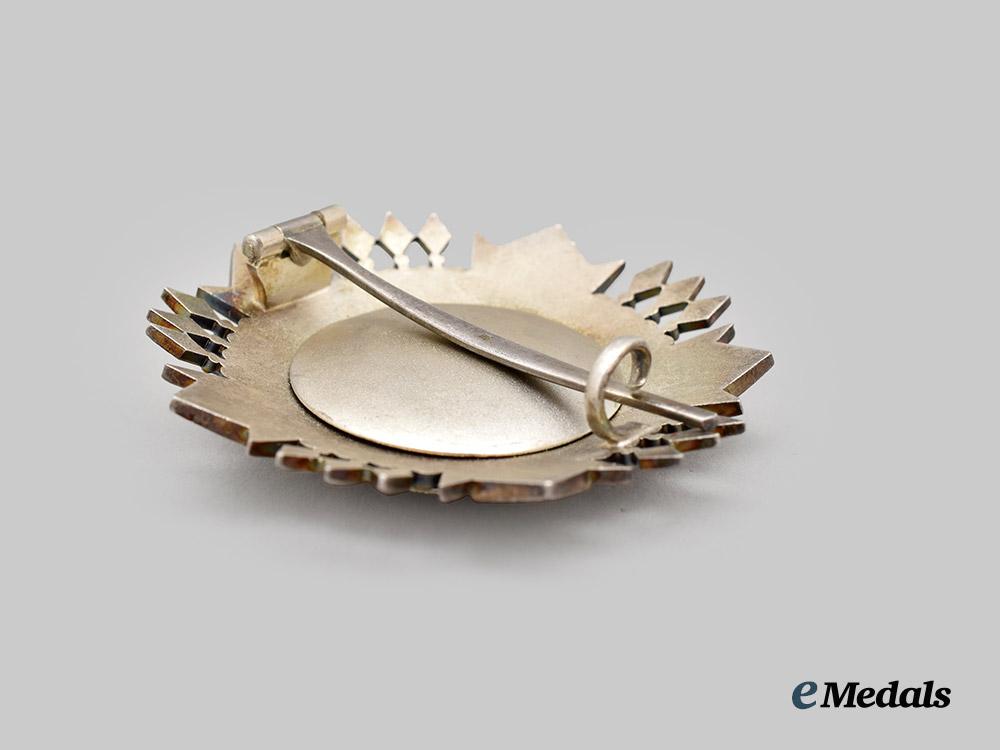 (wisam aljumhuria / وسام الجمهورية). The Star of the Order, in frosted silver, a green enamelled five point star with red enamel borders, three arrows in each quadrant, the obverse medallion bearing the Tunisian coat of arms encircled by a red ring with inscription in Arabic “Republic of Tunisia”, the reverse featuring a vertical pin assembly with a hallmark on the arm, measures 61 mm (w) x 64 mm (h), enamels intact, light wear to silvering on reverse, clasp functional, in fine condition.