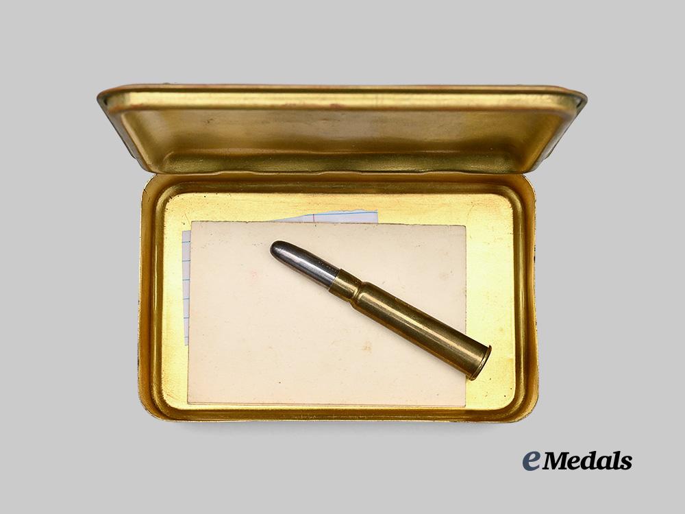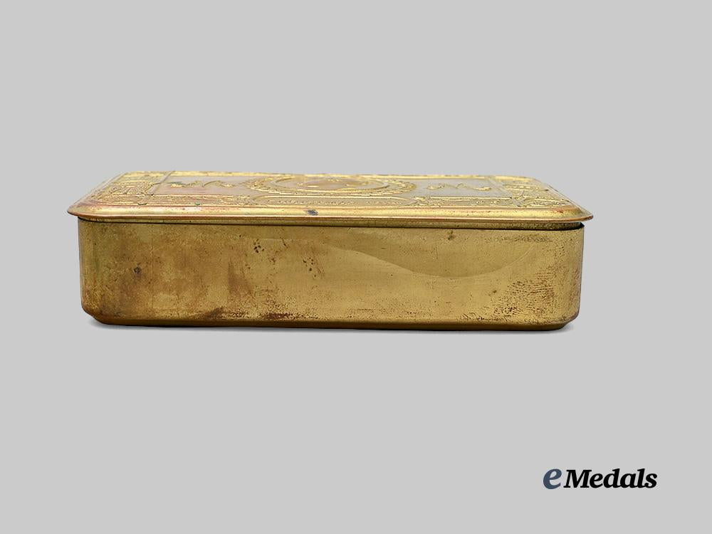 An embossed brass box featuring the left facing profile of Princess Mary, dated ‘CHRISTMAS 1914”, measures 131 mm (w) x 88 mm (h) x 32 mm (h), light wear, hinge functional with seal around the lid crisp. The box contains: