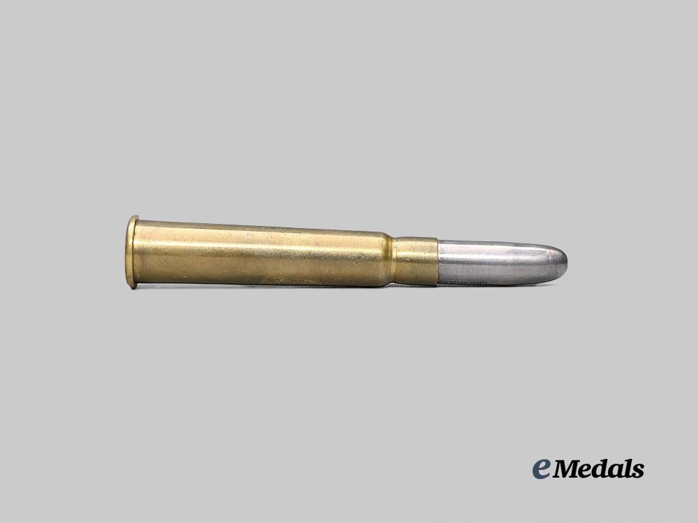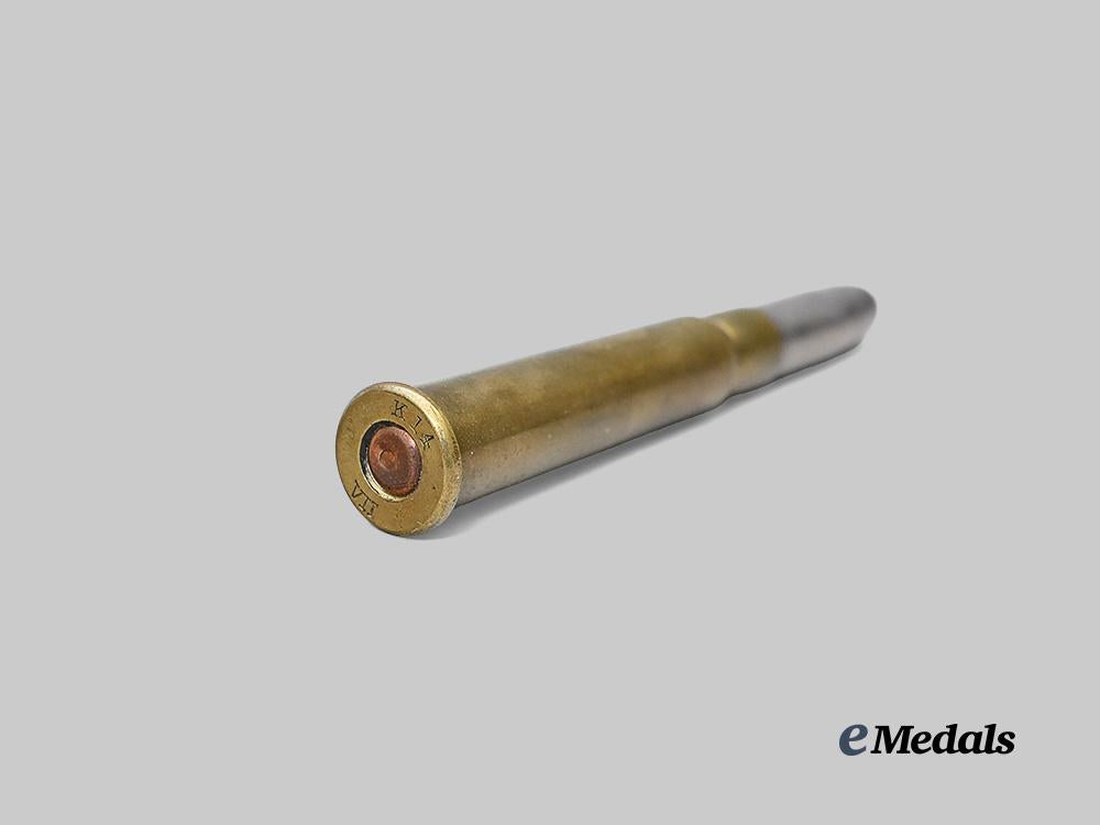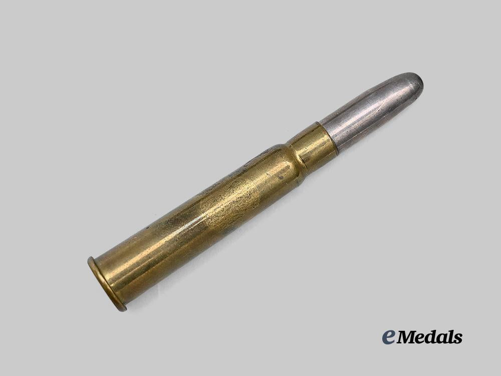 A bullet shell pencil, engraved with a crowned M, based marked K14 VII, lid in silver (marked STERLING SILVER), retaining led pencil inside, very fine.