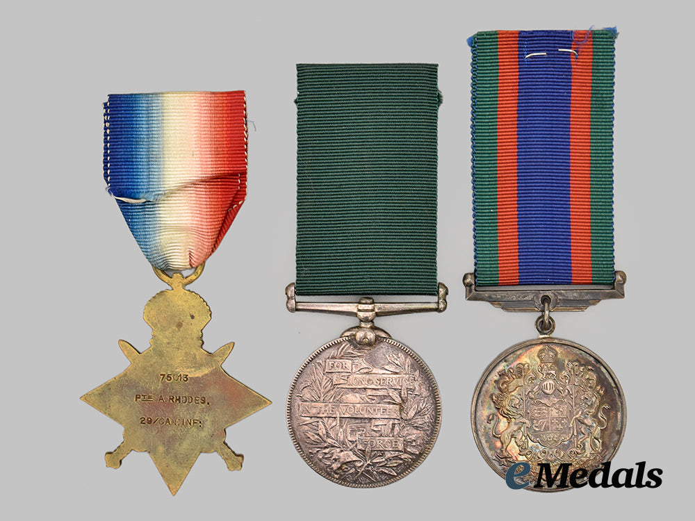 A 1914-15 Star, bronze gilt, reverse impressed 75013 PTE. A. ROHODES. 29/CAN:INF:, worn on original ribbon, light wear, very fine.