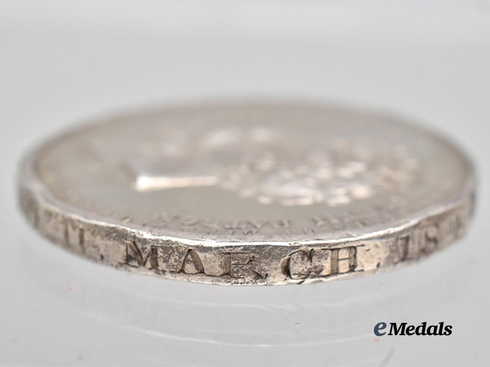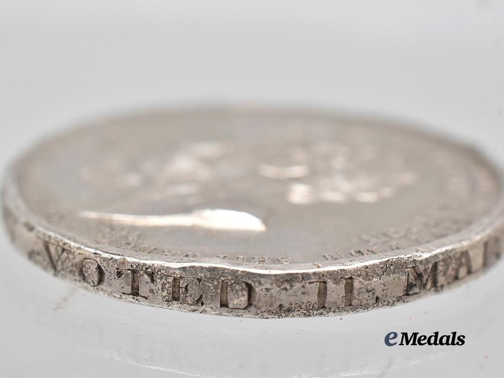 In silver, the obverse featuring the left facing profile of George the IV, encircled by the inscription ROYAL NATIONAL INSTITUTION TO THE PRESERVATION OF LIFE FROM SHIPWRECK, reverse showing four figures, with the above inscription LET NOT THE DEEP SWALLOW ME UP, the rim has been engraved in serif block capitals RICHARD OWEN VOTED 11 MARCH 184, with the rim being cut into and suspension removed, heavy edge bruises, contact marks, and small gouges, measures 35.7 mm (d), weighs 30.58 grams, in better than fine condition.