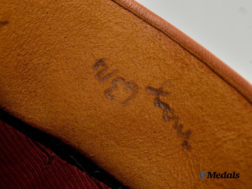A fine quality cap of dark blue wool with red piping, the traditional flat top design bearing a thick leather brim and leather chin strap. The structured cap presents the cap badge of the Royal Engineers in bronze, along with a small Royal Engineers button on each side of the thin leather chinstrap. Two grommetted ventilation holes are present on each side. The interior of the cap features a textured red silk top with a 50 mm thick imitation leather sweatband, and a green undervisor. The diamond shaped manufacturer’s label reads MOSS BROS & CO LTD 20-21 King St. COVENT, GARDEN. The cap measures 250 mm (w) x 105 mm (h), and the interior sticker indicates the size of 6 ¾. The cap presents light mothing on the top, wear to the brim and small areas of contact to the leather chin strap, remains in very fine condition.