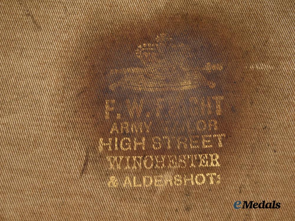 A fine quality cap of dark blue wool with red piping, the traditional flat top design bearing a thick leather brim and leather chin strap. The structured cap presents a textured embroidered band with the central cap badge of the South Lancashire Cap Badge in brass and white metal, along with a small button on each side of the thin leather chinstrap. The interior of the cap features a worn silk interior top with a 43 mm thick imitation leather sweatband, and a green undervisor. The printed manufacturer’s label reads F.W. FLIGHT ARMY TAILOR HIGH STREET WINCHESTER & ALDERSHOT:. The interior band against the brim has been reinforced with a strip of velvet, which the name CARY has been penned above in black ink. The cap measures 244 mm (w) x 103 mm (h), and the interior sticker indicates the size of 6 ¾. The cap presents wear to the brim, heavy wear on the sweatband and interior, and small areas of contact to the leather chin strap, remains in very fine condition.