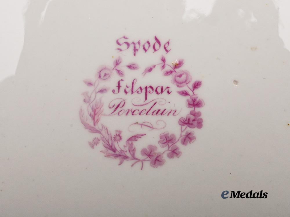 A large felspar porcelain plate, with a slightly scalloped edge, the obverse center featuring the handpainted Arms of the East India Company above the motto AUSPICIO REGIS ET SENATUS ANGLIAE, with three floral patterns and delicate border. The reverse is marked “Spode Felspar Porcelain” with a floral wreath. The plate measures 258 mm in diameter. A small chip is present on the reverse in the raised ring, light wear to the surrounding gold paint and small scratches present on the obverse, remains in near extremely fine condition.