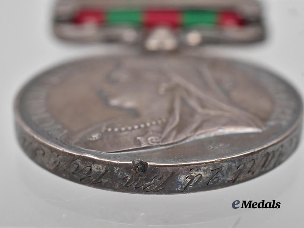 In silver, rim engraved 4776 Pte J. Hart 2d Bn Rgt Ir. Regt., with PUNJAB FRONTIER 1897-98 and SAMANA 1897 clasps, dark patina, two notable gouges in the edge, scratches present, remains very fine.