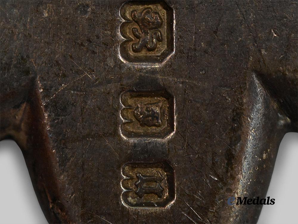 In frosted silver, maker marked "SG" (Sebastian Garrard), hallmarked with the British lion, marked with a leopard's head (made in London) and date marked "o" (1929) on the reverse, measuring 48.9 mm (w) x 62.4 mm (h), dark patina and wear to silver finish, very light contact, original military ribbon, near extremely fine.