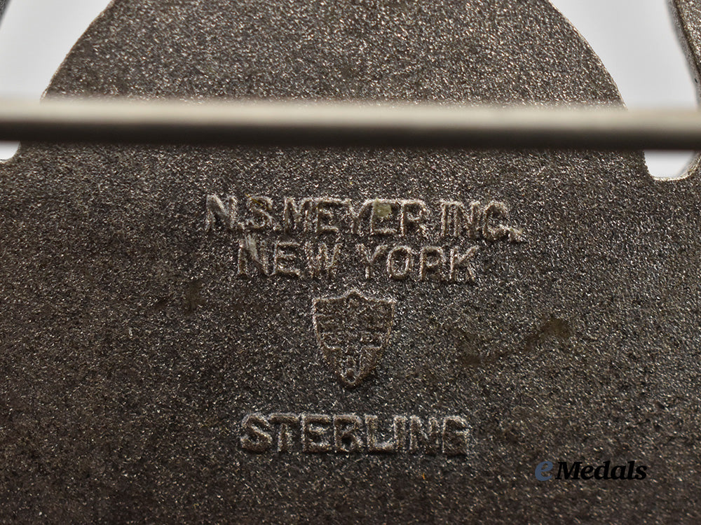 4. Army Air Force Bombardier Badge: in sterling silver, marked " N.S. MEYER. INC NEW YORK STERLING" on the reverse, measuring 76.1 mm (w) x 24.7 mm (h), horizontal pinback, very light contact, near extremely fine.