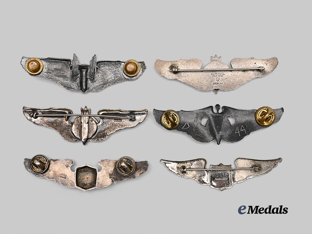 1. Army Air Force Pilot Badge: in sterling silver, marked "AMICO STERLING" on the reverse, measuring 76.7 mm (w) x 19.0 mm (h), reverse bears two pins with butterfly clips, lovely patina, very fine.