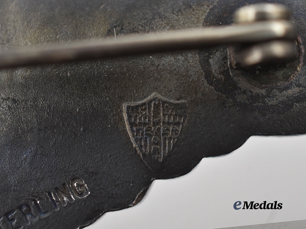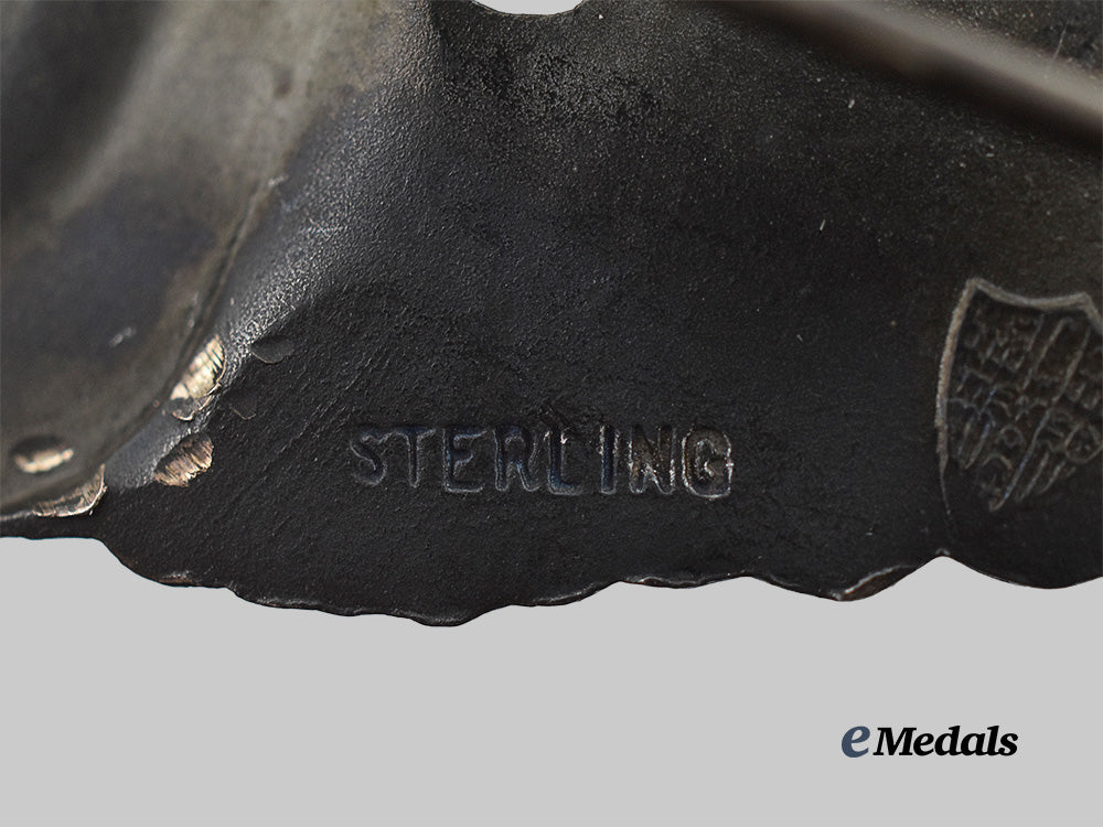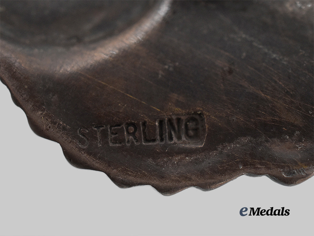 A Glider Pilot Badge: in sterling silver, marked “STERLING”, with maker mark of N.S. Meyer, New York, measures 76.8 mm (w) x 21.5 mm (h), light wear, very dark patina, in very fine condition.