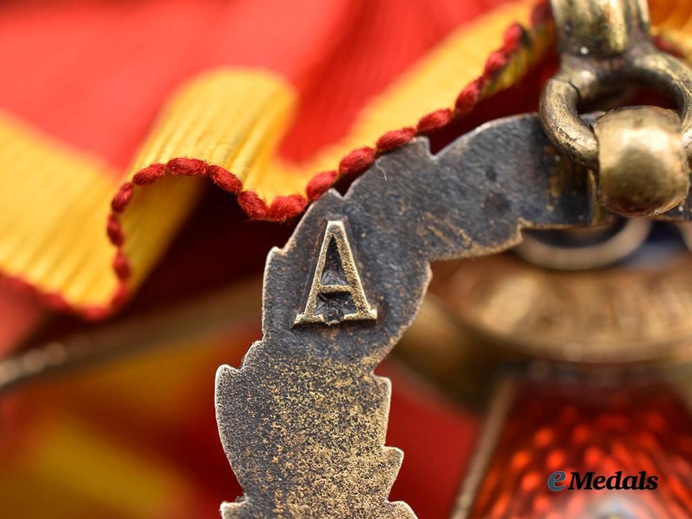 (Ordine di San Gregorio Magno). Instituted in 1831. Civil Division. Multi-piece construction, in silver gilt with red and blue enamels, each of the eight points of the cross exhibiting a ball finial, surmounted by a trophy of arms in silver gilt, unmarked, measuring 55.7 mm (w) x 87.3 mm (h) inclusive of its laurel wreath suspension, intact enamels, on its original full-length neck ribbon. Maker marked "TANFANI & BERTARELLI A" on the back of the laurel wreath, extremely fine.